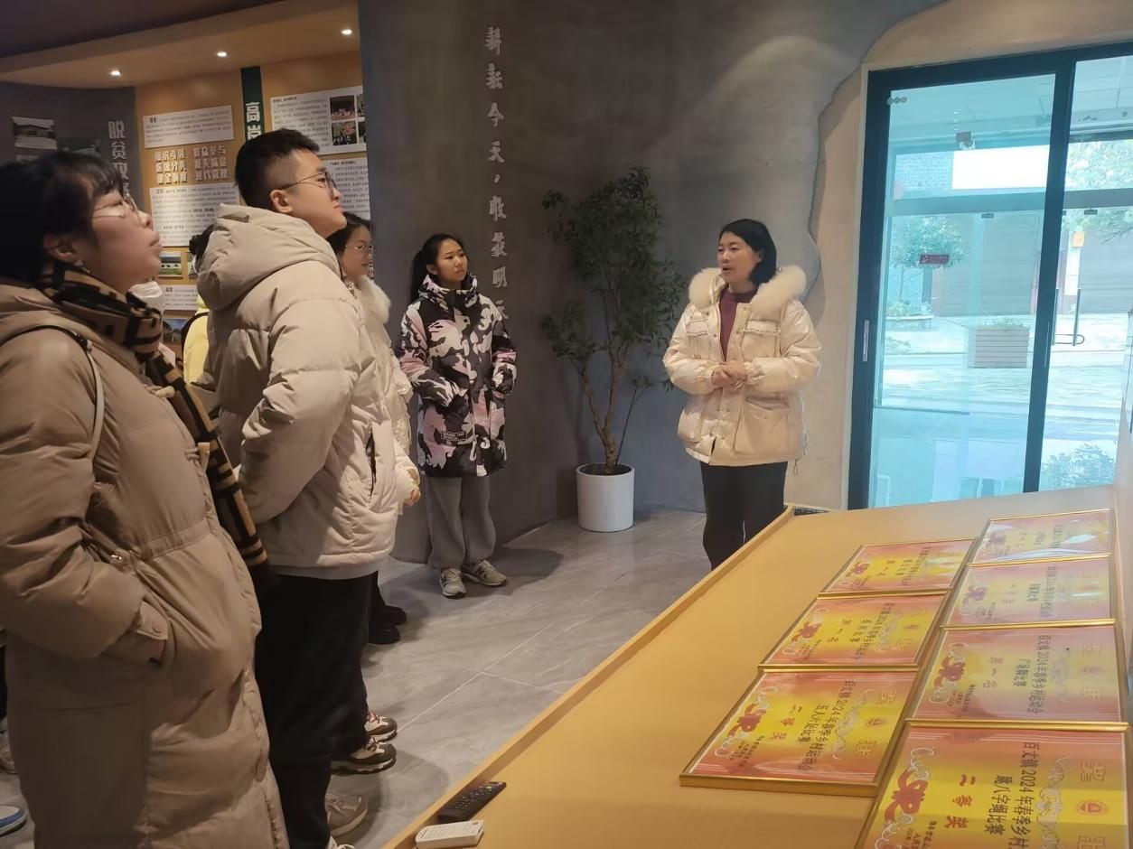 高岗村党委书记、村委会主任吴洪琴首先带领师生团队参观了村史馆和乡村振兴直播间。在参观过程中,吴洪琴深刻阐释了“高岗村2.0模式”的核心内涵,介绍了高岗村的文化底蕴与发展规划,直观地展示了高岗村在促进当地经济增长、推动当地发展中探索出的创新性成功路径。