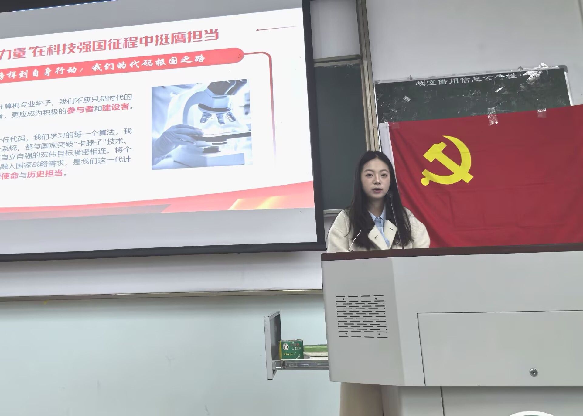 范颖焓同志以习近平总书记关于科技强国的重要论述为主线,结合《朝着建成科技强国的宏伟目标奋勇前进》等重要文章精神,系统阐释了科技自立自强作为国家发展战略支撑的重大意义。她通过数据与案例展示,回顾了我国在全球创新指数排名、研发投入及量子信息、航天科技等领域的突破性进展。在谈到计算机学科使命时,她号召新时代青年要学习孙家栋院士“干惊天动地事,做隐姓埋名人”的精神品质,对标DeepSeek团队、宇树科技等创新标杆,在核心软件自主可控、算力与芯片协同创新、网络安全、人工智能等关键领域勇攀高峰,让青春力量在科技强国征程中挺膺担当。
