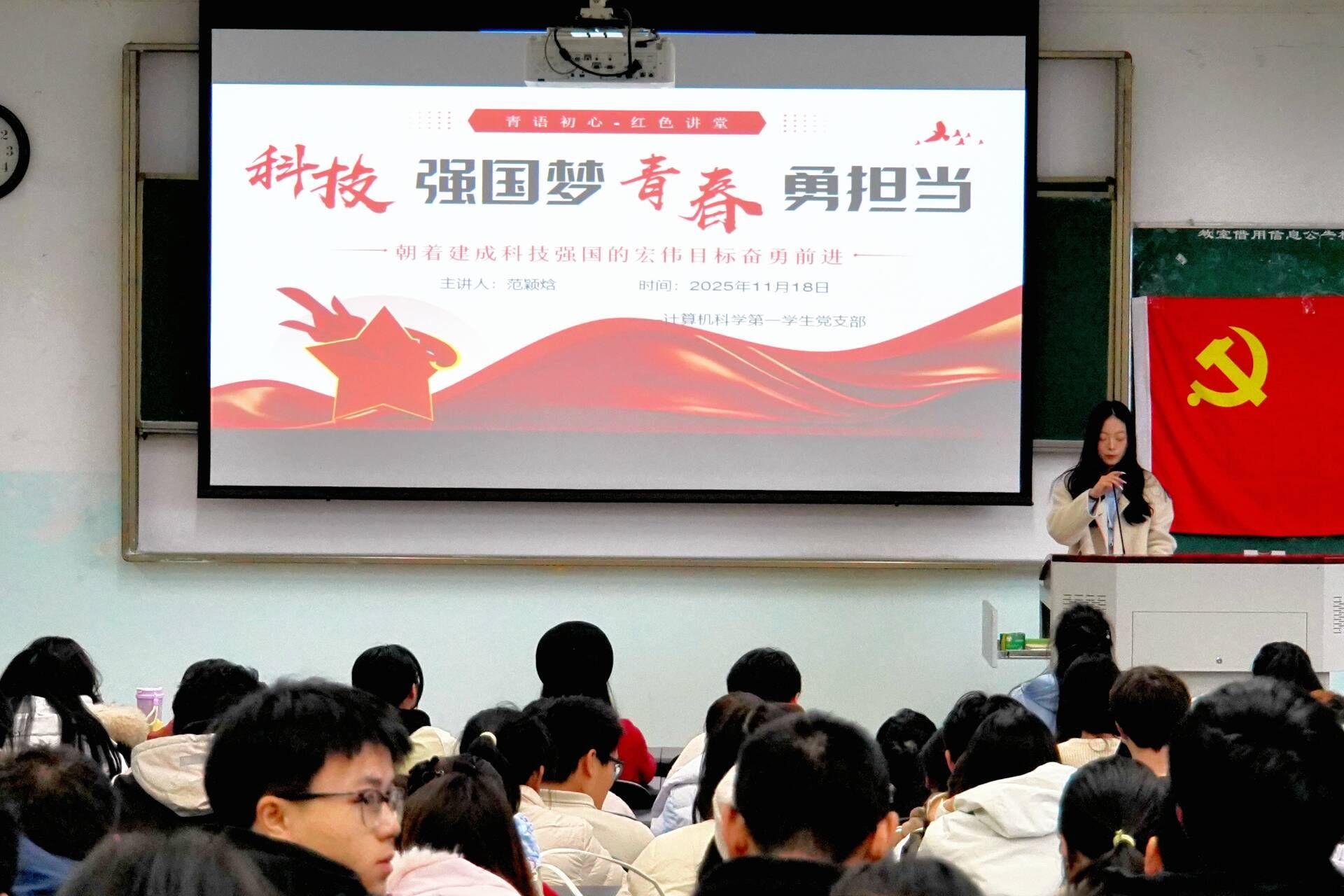 为深入学习贯彻习近平新时代中国特色社会主义思想,引导青年党员传承红色基因,计算机科学第一员工党支部创新打造“青语初心”红色系列讲堂。2025年11月18日下午,首期讲堂在10教A403教室举行,主题为“科技强国梦,青春勇担当”。主讲人为支部党员范颖焓同志。全院预备党员、入党积极分子共250余人参学。
