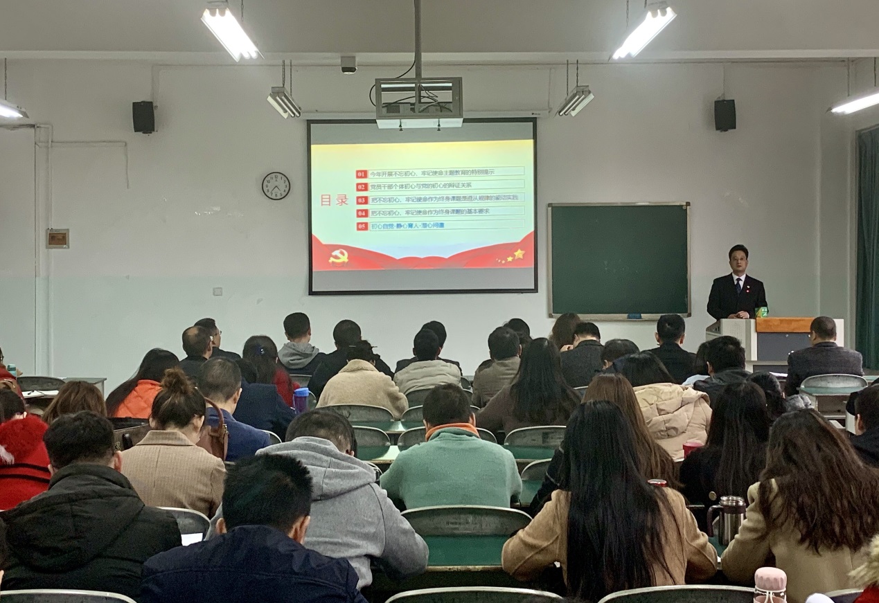 报告会上,王斌引经据典,用一个个鲜活的案例,从今年开展不忘初心、牢记使命主题教育的特别提示,党员干部个体初心与党的初心的辩证关系,把不忘初心、牢记使命作为终身课题是遵从规律的能动实践和基本要求,高校教师要坚守初心自觉、静心育人、潜心问道等五个方面为与会100余名教职工作了一场精彩的报告。