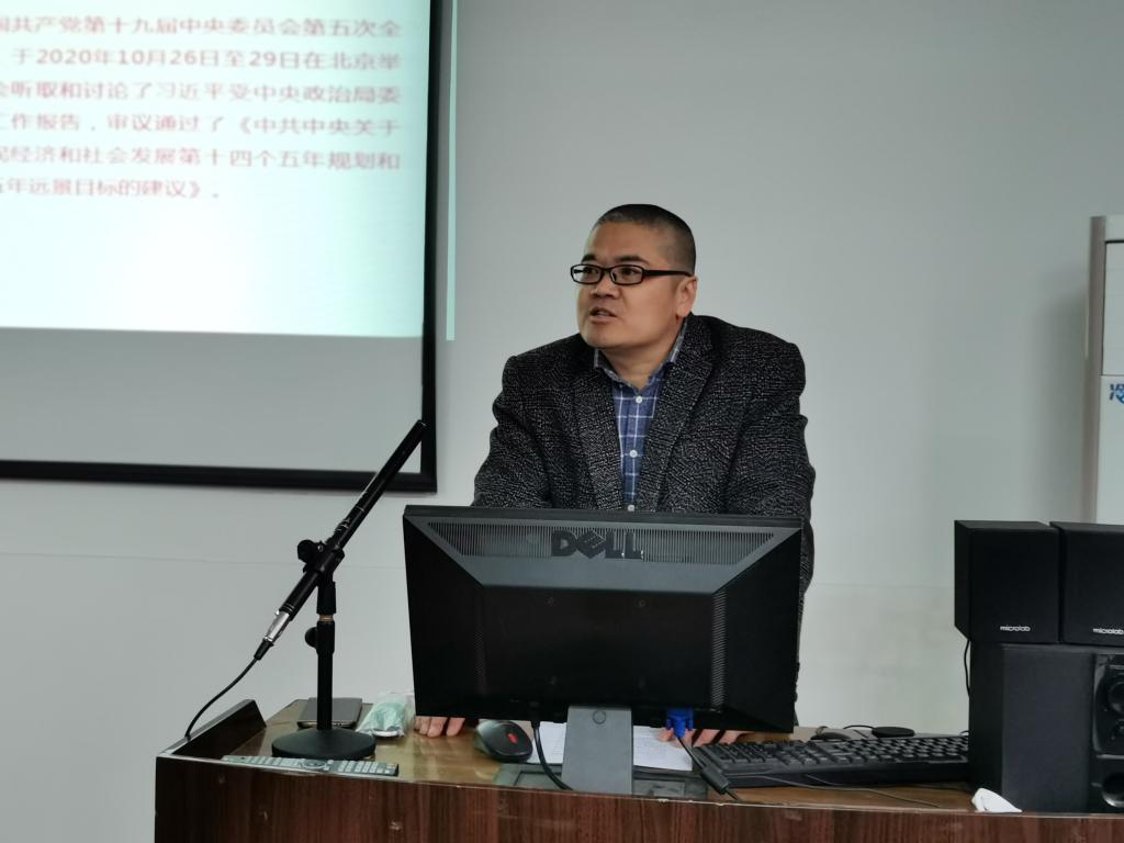 会上,王中成带领全体教师专题学习了第十九届五中全会会议精神,重点讲述了全会提出的“十四五”时期经济社会发展指导思想、主要目标和必须遵循的原则,以及二〇三五年基本实现社会主义现代化国家远景目标。他谈到,过去5年,在错综复杂的国际、国内发展形势特别是新冠疫情的严重冲击和风险挑战下,我国“十三五”规划目标任务即将完成,全面建成小康社会取得决定性成就,令人振奋。这次全会是在“两个一百年”奋斗目标的历史交汇点召开,将“十四五”规划与2035年远景目标统筹考虑,擘画了未来5年和15年的发展蓝图,为全面建设社会主义现代化国家,实现第二个百年奋斗目标指明了方向,具有历史性的重大意义。
