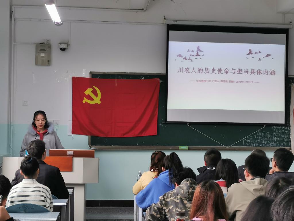 汇报伊始,由信息支部苏诗琪同志带来主题为“川农人的历史使命与担当的内涵”自学结果汇报,以江姐、颜济与周开达等多位名人事迹为实例,为我们更深入的解释了川农人的使命与担当的内涵,最后重点强调了作为川农学子应如何践行。接下来由各支部依次展示,各支部都能在讨论时基本结合党的性质、党的指导思想及党的宗旨等,同时紧扣主题,从不同的方面进行阐述学习结果。