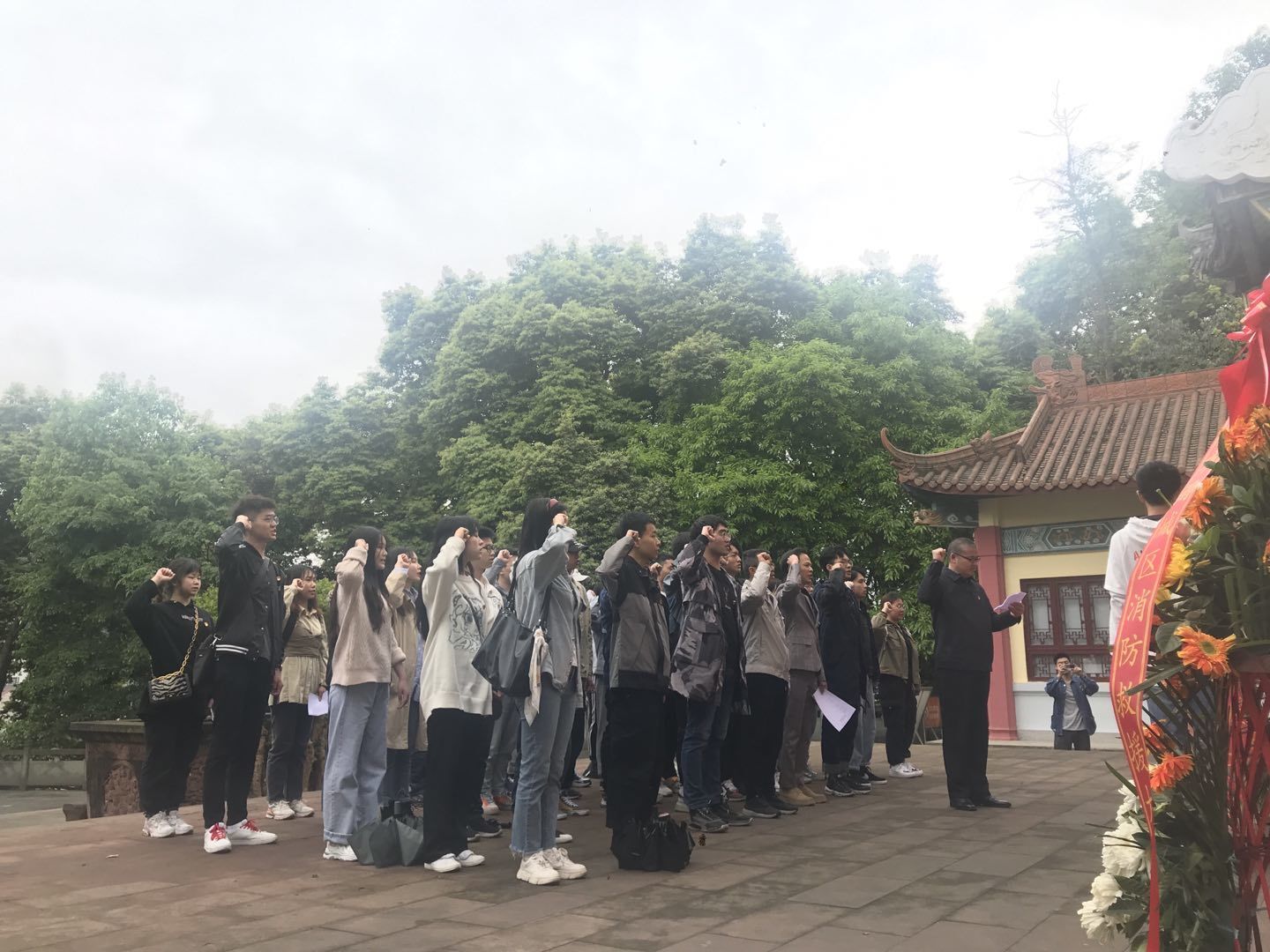 绵绵细雨中,师生党员佩戴党徽,正面革命烈士纪念堂,挺直肃立,金黄色的党徽在红色旗帜上显得格外引人注目,献花,默哀,集体朗诵毛泽东的《七律·长征》;在党史故事分享环节,物联网专业员工党支部书记陈明滟结合自身在泸定桥干部公司的专题培训经历,和现场师生党员分享了“飞夺泸定桥22勇士”的故事,两名女党员代表还分别分享了四川宜宾赵一曼和四川自贡江竹筠轰烈柔情的革命事迹。