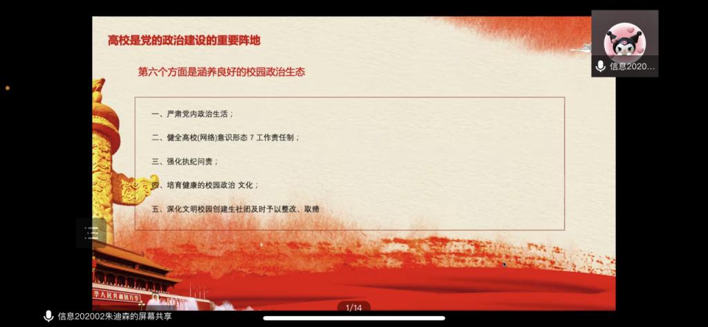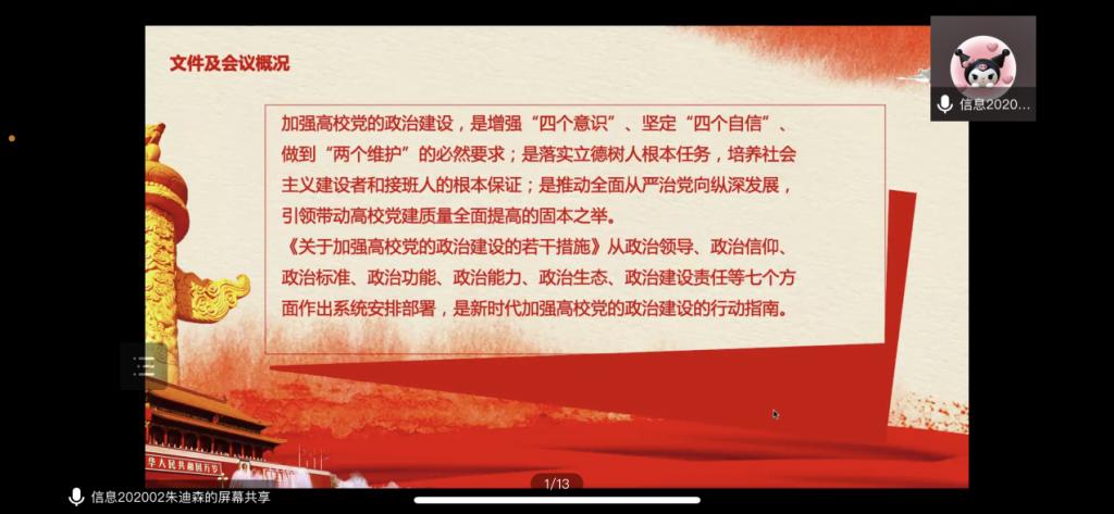 会议初始,主持人带领大家了解了《关于加强高公司党的政治建设的若干措施》的相关文件及会议情况,新时代党建理论的重大创新以及新时代党建总体布局的统领地位,让同学们对本次学习有更深的理解。