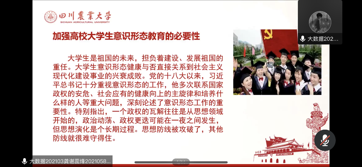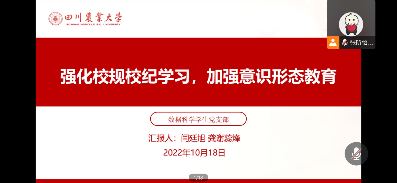 10月18日下午,数据科学员工党支部组织开展了以“强化校规校纪学习, 加强意识形态教育”为主题的线上政治学习会。会议由龚谢蕊烽,闫廷旭同学主持。支部全体同志参加,学习氛围浓厚。