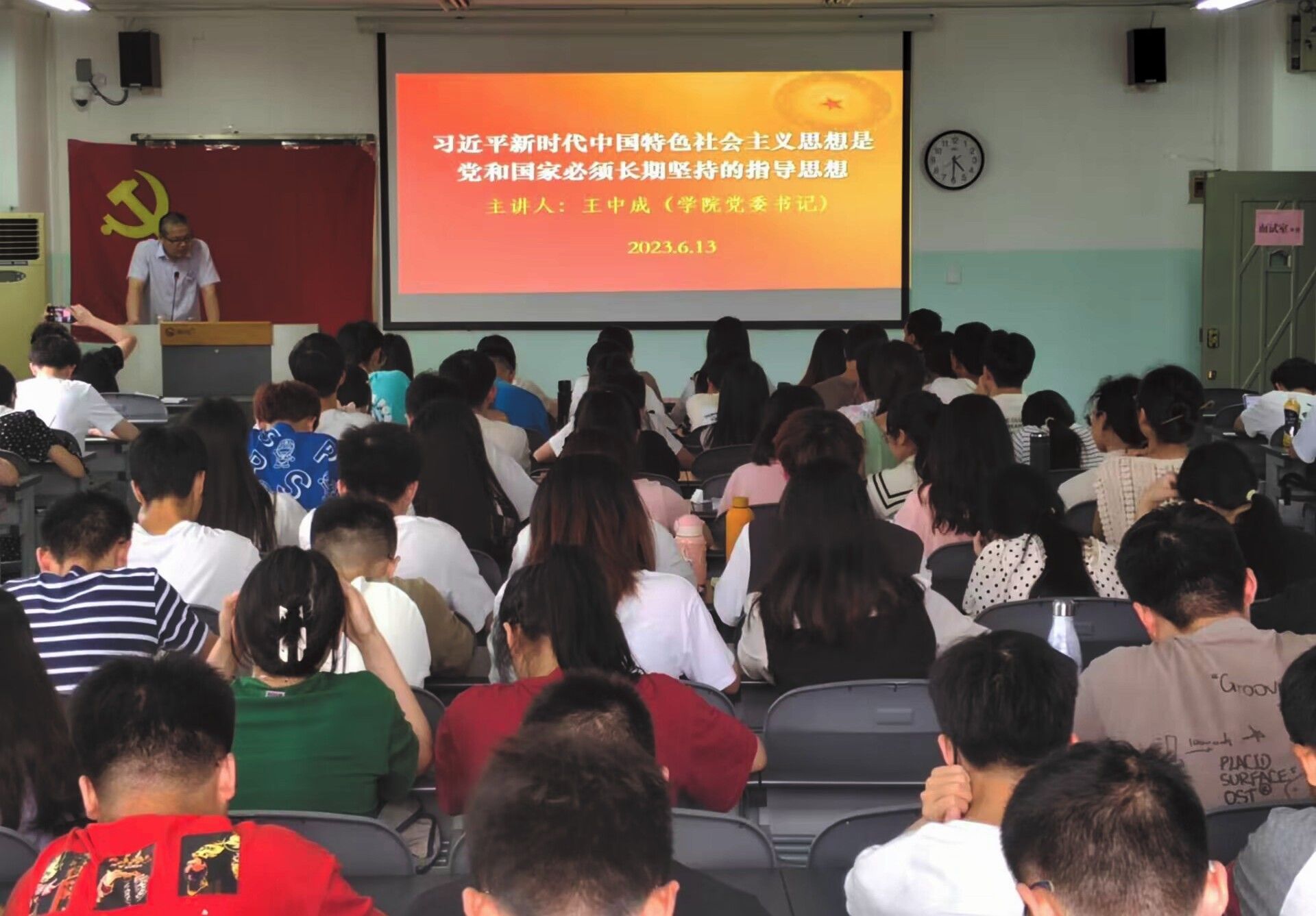 王中成书记围绕习近平新时代中国特色社会主义思想的形成,核心要义、内容及理论品格,习近平新时代中国特色社会主义思想是经过实践检验的强大武器,21世纪马克思主义、当代中国马克思主义等四个方面,深入浅出、系统全面地讲述了习近平新时代中国特色社会主义思想理论体系。他强调本次主题教育的总要求是学思想、强党性、重实践、建新功。他要求全体党员要认真学习贯彻习近平新时代中国特色社会主义思想,不断提高自身的政治思想觉悟和党性修养,始终将政治意识放在首位,做讲政治有理想、讲规矩有纪律、讲道德有品行的新时代青年。他希望同志们要始终牢记自己的共产党员身份,时刻想到自己是党的人、是组织的一员,时刻不忘自己应尽的义务和责任,在党言党、在党忧党、在党为党,把爱党、忧党、兴党、护党落实到工作学习生活各个环节,起好党员先锋模范带头作用。