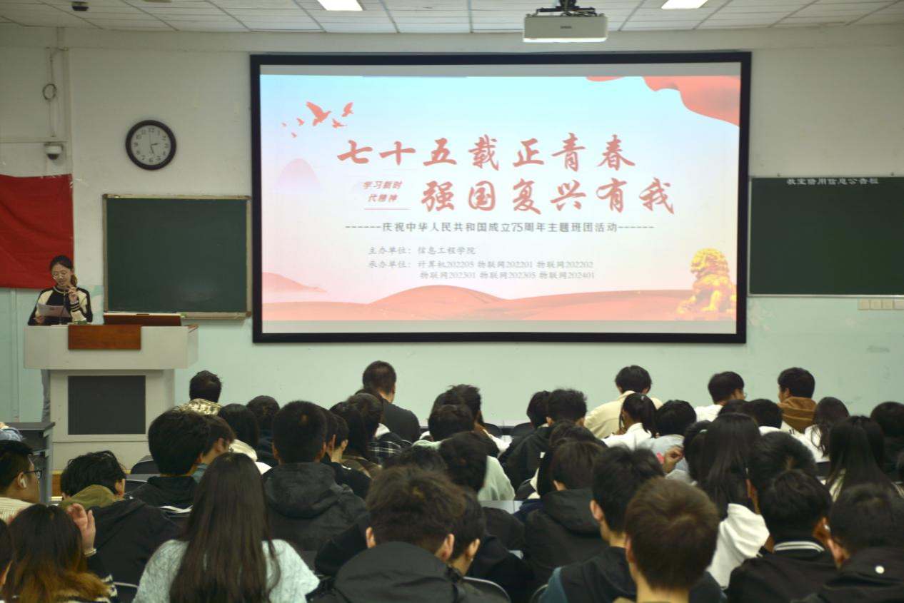 为深入学习宣传贯彻习近平总书记在庆祝中华人民共和国成立75周年招待会上的重要讲话精神,进一步激发广大青年员工的爱国情怀,强化责任担当意识,增进班级凝聚力,共铸强国之梦,计算机202205团支部、物联网202201团支部、物联网202202团支部、物联网202301团支部、物联网202305团支部、物联网202401团支部于11月3日14:20-16:00在十教A101联合开展了“七十五载正青春,强国复兴有我”主题班团活动。