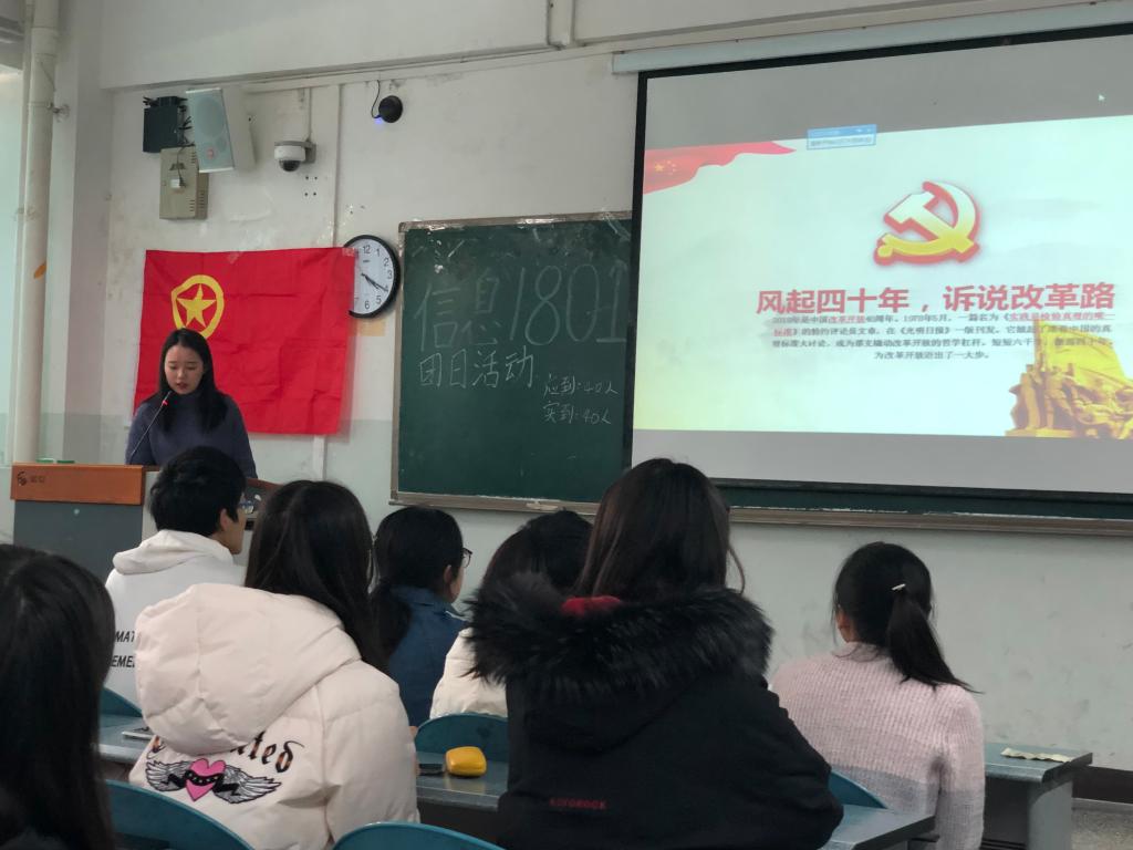 2018年11月22日下午16:20,太阳成集团tyc151cc信息201801团支部全体成员提前到达集会地点育新楼A208,准时开展团日活动。四十年改革开放,华夏春风吹满地,中国实现了从落后到先进的巨大飞跃,而中国人民也从物质和精神上感受到了巨大的变化。本次团日活动便以“风起四十年,诉说改革路”为主题,来纪念改革开放四十周年来的光辉历程。