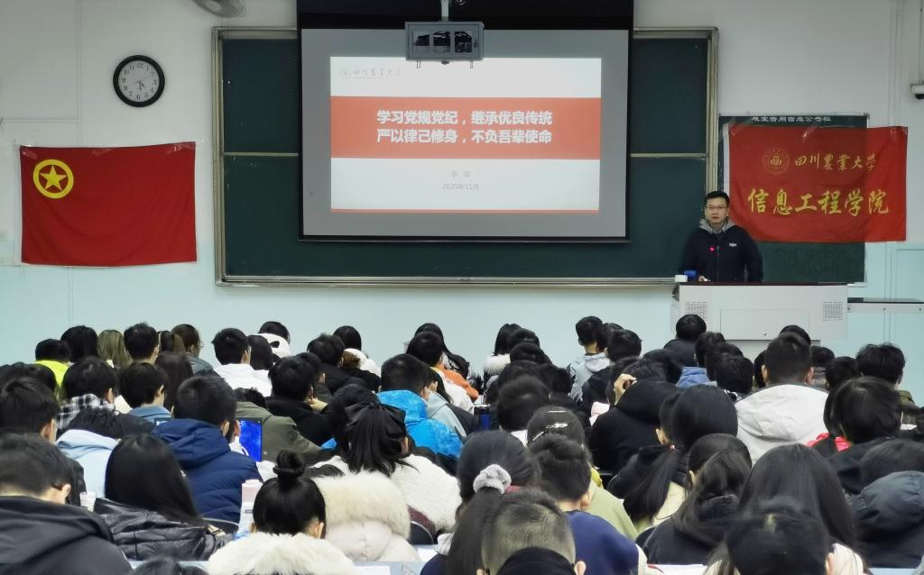 2020年11月24日16:20,公司在十教-A403举办院青马班和团校第三讲团课。本次团课由公司纪委书记、副经理李军副教授担任主讲人,主题是“学习党规党纪,继承优良传统;严以律己修身,不负吾辈使命”。院青马班和团校等200余名同学到场聆听。