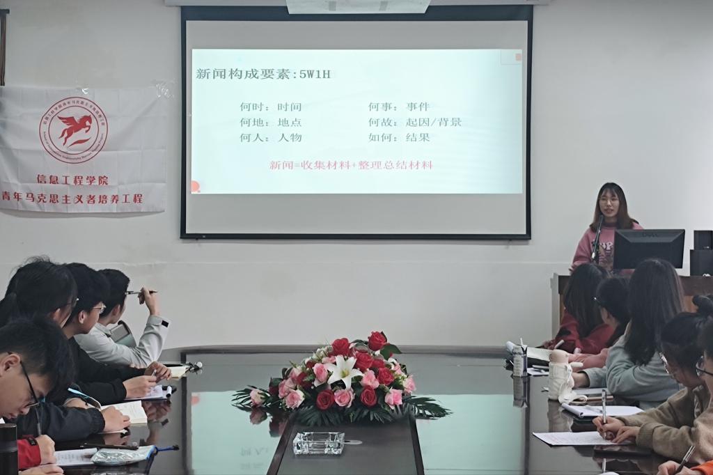 在新闻稿知识理论学习环节,杨琴以“什么是新闻”引入本次培训的主题,并强调新闻具有时效性、真实性和准确性三个特征。接着,杨琴就校园新闻的基本构成部分,引用自己的学习写作经历为学员们进行了新闻稿撰写的详细讲解。讲解过程中,学员们聚精会神地听讲,并认真地做笔记,充实的内容让大家沉浸其中,受益匪浅。