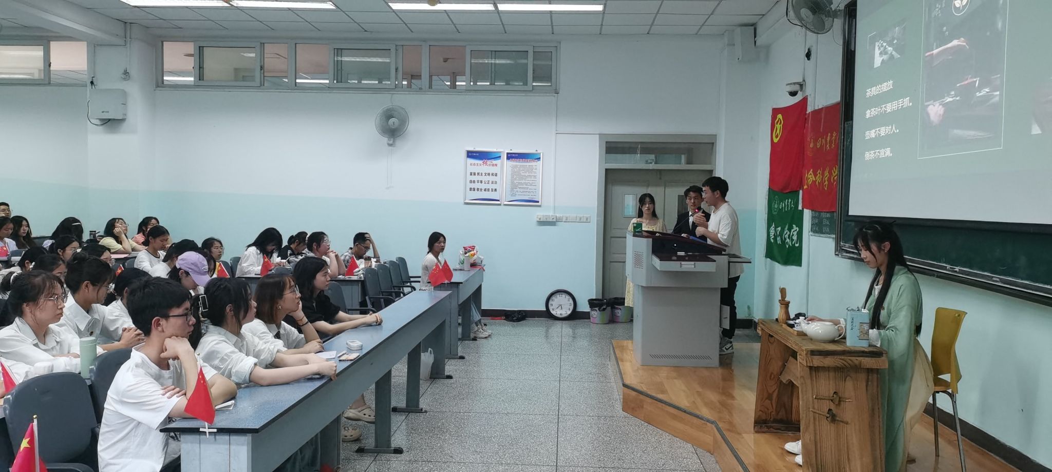 “今天,一个腾飞的中国,更让人读得生动、读得自豪。”诗歌朗诵《青春中国》现场声音嘹亮,斗志昂扬,展现出青年学子对祖国的热爱。为加强对国粹传承和非物质文化遗产保护的支持和扶持,铸牢中华民族共同体意识,员工手工协会的刺绣文化分享和员工国风社的茶艺文化分享为同学们打开了非遗文化的大门,使在场许多同学见识到了传统文化之高深与丰富多彩,强化了当代年轻人对于的文化自信和认同。