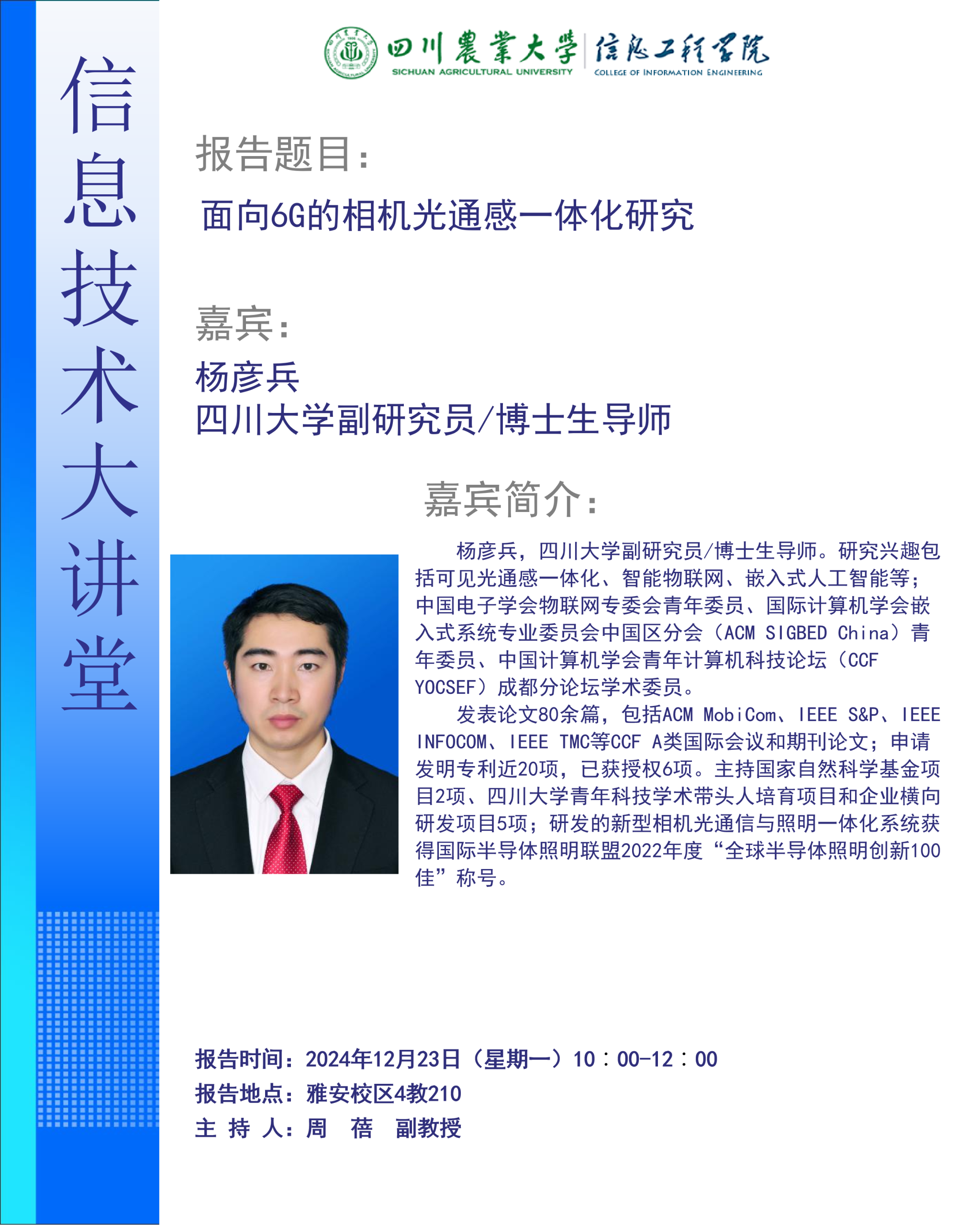 为引导员工深入学习专业知识、了解行业发展情况。12月23日,四川大学副研究员、博士生导师杨彦兵受邀做客太阳成集团tyc151cc《信息技术大讲堂》,在四教210开展题为《面向6G的相机光通感一体化研究》的专题讲座。电子信息2024级研究生参加,讲座由周蓓主持。