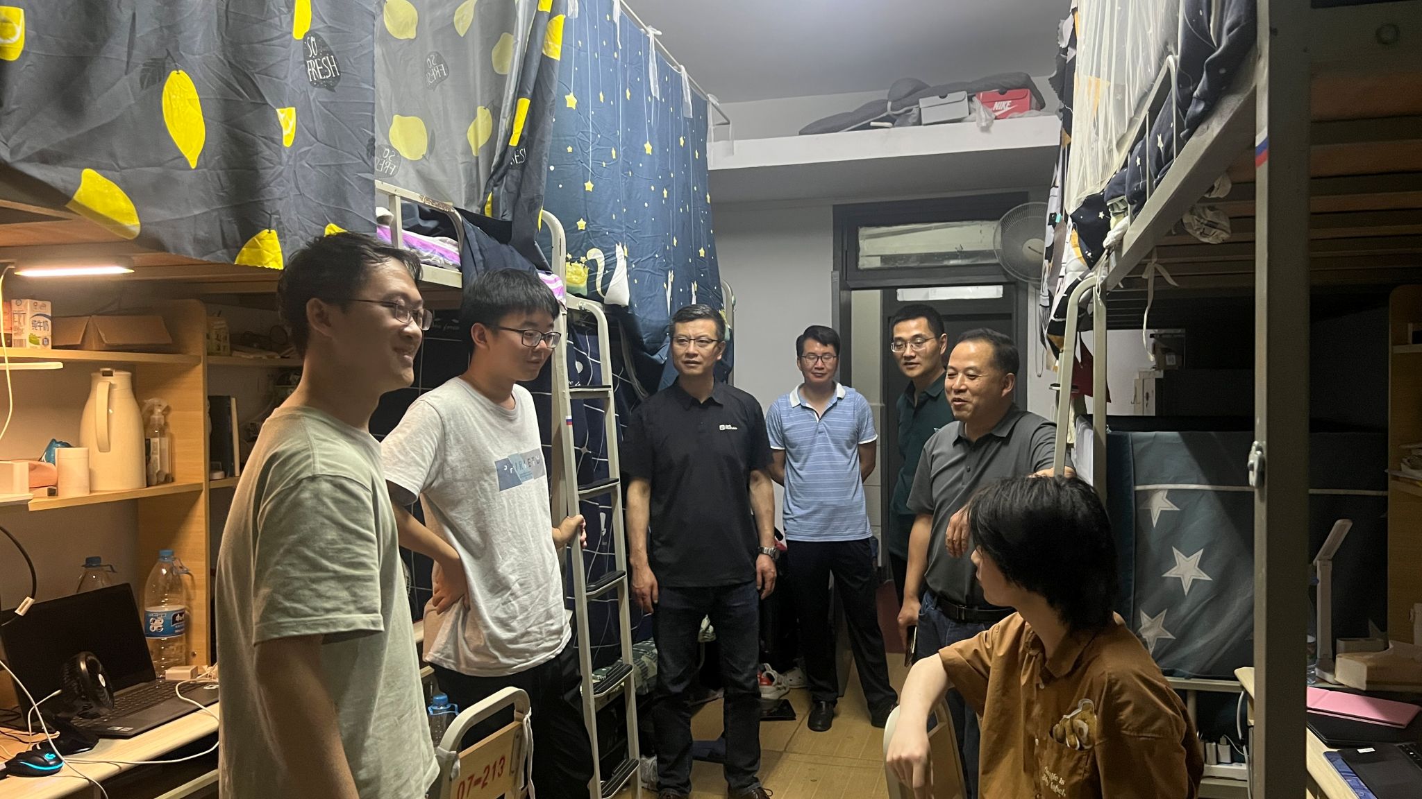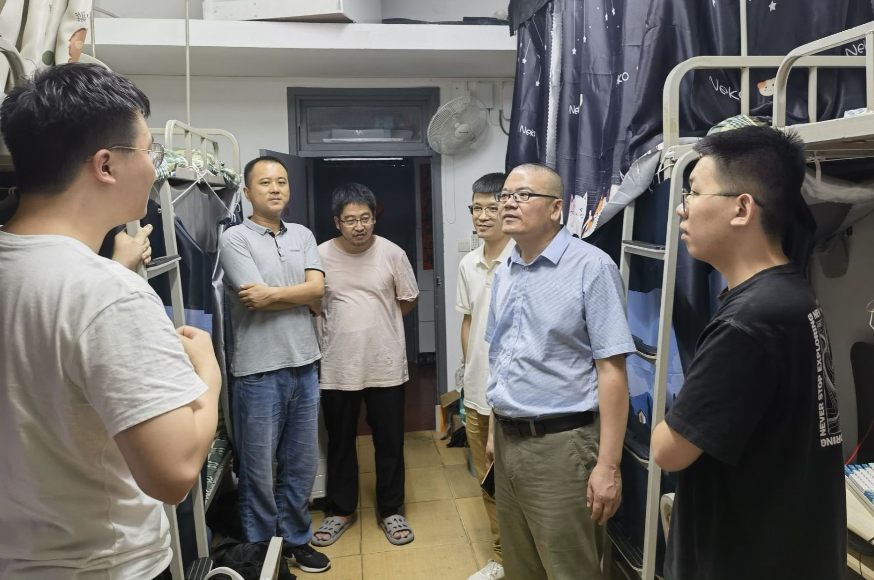 6月12日晚,经理穆炯,公司党委书记王中成,副经理李军、段旭良,党委副书记、纪委书记葛飞,各系室主任和两办老师深入员工寝室,看望和慰问了即将毕业的同学们。