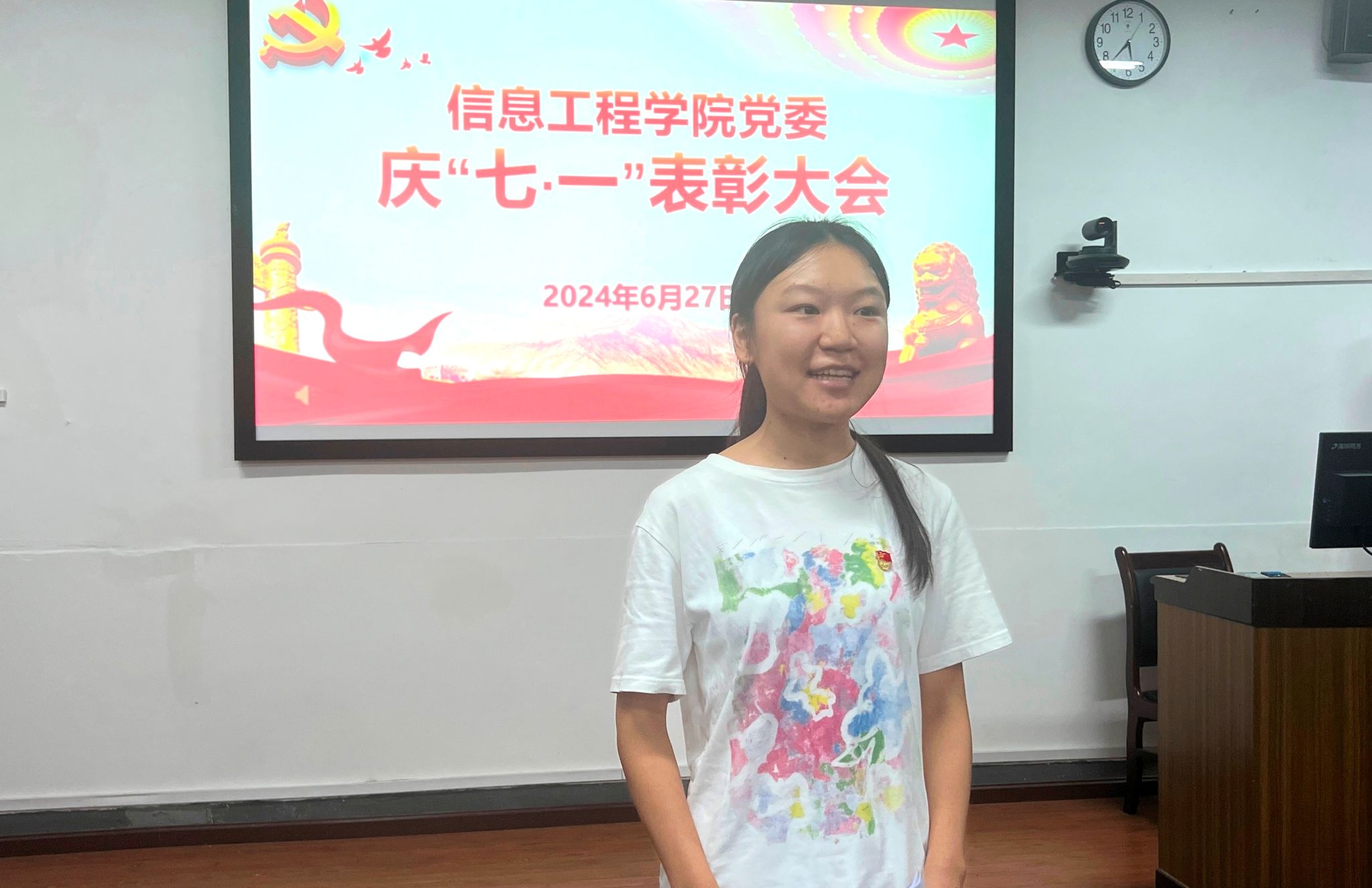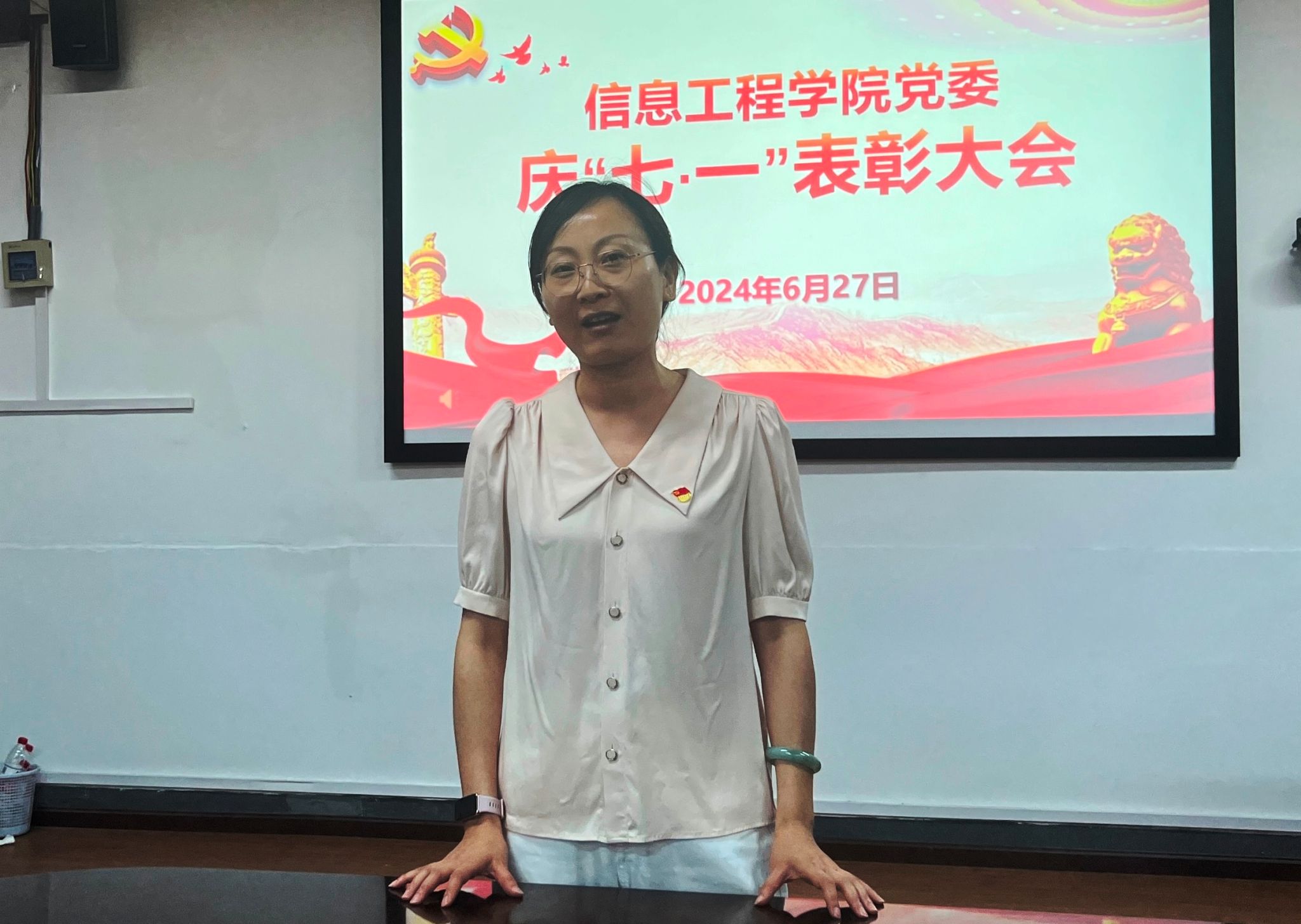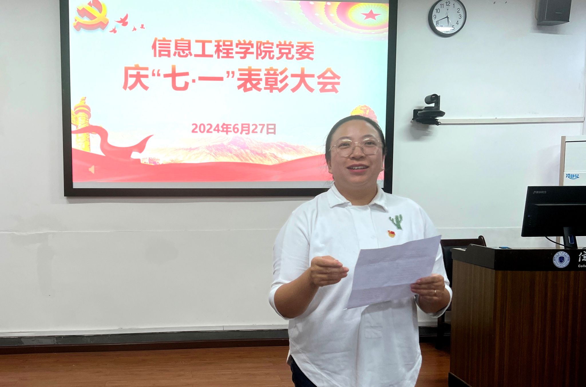 会上,数据科学系教工党支部书记周蓓老师作为先进党支部代表发言,分享了支部在政治建设、组织建设和党建创新活动等方面的经验和成果,展示了如何在日常工作中贯彻党的教育方针,增强支部的凝聚力和战斗力。教职工优秀共产党员代表陈晓燕、员工优秀共产党员代表舒悦分别发言,她们从个人成长和实际工作出发,表达了对党的忠诚、感谢以及未来努力的方向,表示将继续不忘初心、牢记使命,砥砺前行。