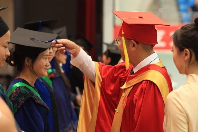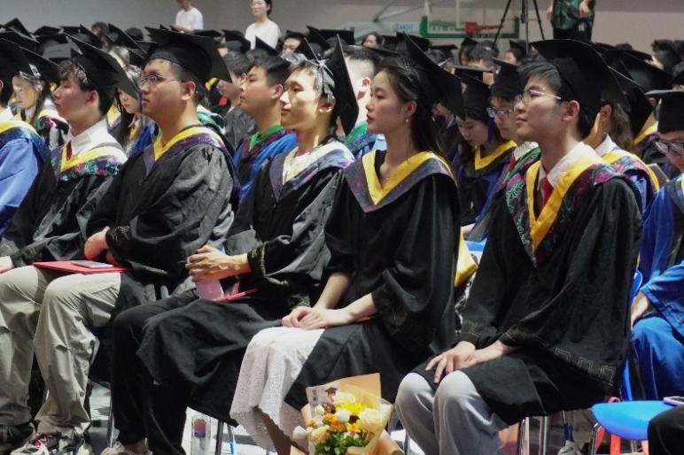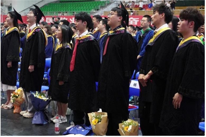 在轻快的《相聚在桂花飘香的时节》校歌声中,刘登才与穆炯为硕士研究生拨穗授位,然后是本科生依次接受主席台领导的学位授予。当流苏从右肩拨至左肩的瞬间,现场响起经久不息的掌声。
