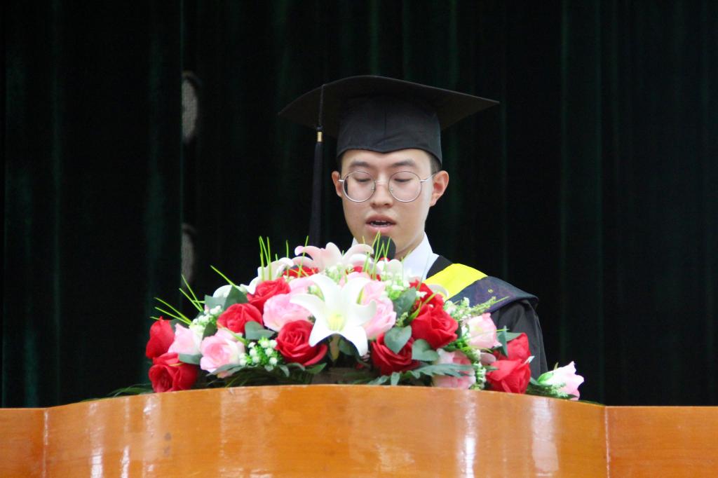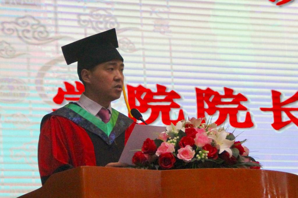 毕业典礼在庄严的国歌声中开始,高雪松经理致辞。他首先代表全院2353名师生向圆满完成学业的2019届毕业生表示热烈的祝贺,号召同学们向所有为他们的成长成才付出辛劳、默默奉献的父母、老师和亲友们表示衷心的感谢!他总结了2019届毕业生取得的突出成绩:在2019届毕业生中,1人获评校级优秀员工标兵;55人光荣加入中国共产党;6人被授予四川省优秀大学毕业生;214人次被评为校级优秀团干部、优秀员工干部、优秀团员、优秀员工、寒梅飘香工程公益之星等荣誉称号;136人次获国家励志奖学金、陈育新优秀员工奖学金等各类奖学金;员工以第一作者发表EI论文8篇,参加省市级以上竞赛获奖22项;有64人继续攻读研究生学位,其中11人到伦敦国王公司、南加利福尼亚大学、伯明翰大学、利兹大学、爱丁堡大学等国际著名学府留学深造,48人进入国防科技大学、中山大学、电子科技大学、厦门大学、上海交通大学等985、211工程大学;102名同学进入腾讯、京东、中国移动、中国联通、中国电信、比亚迪等世界/中国500强企业,其中21名同学被中国人民银行、中国工商银行、中国建设银行、上海浦发银行、招商银行、中国银行等8大银行高薪聘用。他表示,公司全体老师对同学们取得的优秀成绩倍感自豪。对于即将带着理想奔赴新的岗位、面临人生新的起点和希望的毕业生们,高雪松经理分享了三点感悟:一是“保持改变”。他谈到,未来具有不对称性、不确定性和复杂性。不久的将来,简单的、重复性的工作将被人工智能取代。在这场竞争中,我们必须变成创新性学习者,保持在路上、在改变的心态,努力超越自我。二是“懂得敬畏”。凡善怕者,必身有所正,言有所规,行有所止,偶有逾矩,亦不出大格。我们要常怀敬畏之心,方能行有所止。要懂得敬畏自然、敬畏生命、敬畏道德、敬畏法律,时刻保持清醒,保持坦荡,保持品格。三是“静待生活”。在以快为尺度的信息时代,他提醒同学们,要懂得静下来,慢下来,倾听自己的内心,体会生活的真谛。他希望各位毕业生身处“信息技术的需求如此巨大和迫切”的新时代,要做好自己,继续传承和发扬“川农大精神”,“德信立人,以工成事”,“勤学修身,笃行创新”。