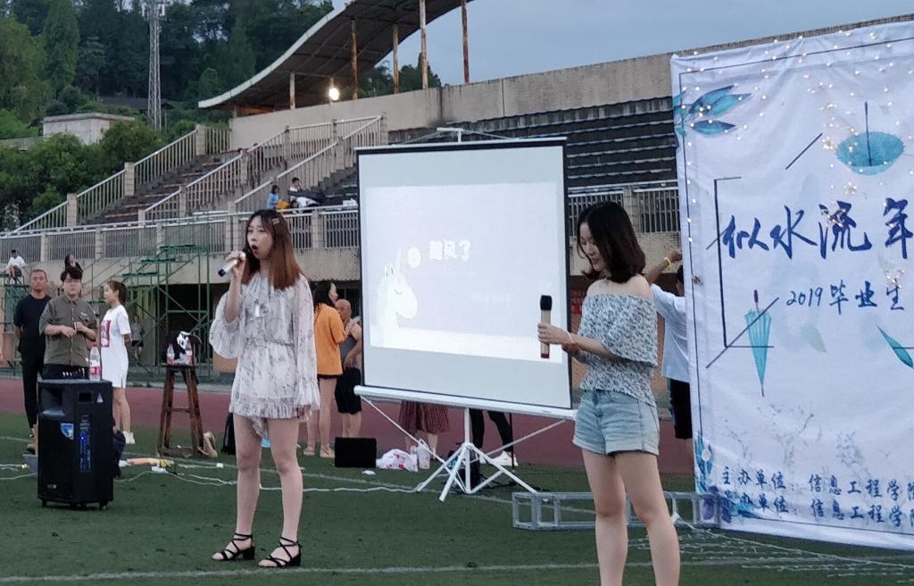 再见于金黄的夕阳下,相聚于渐凉的夏风中,曾分散天涯的学子,再度回到他们最初相识的地方,为曾经的似水流年送上最深情的演唱。在观众的期待中,信工院舞蹈团带来的一支热情洋溢的舞蹈拉开了晚会的序幕。或许是临别前不舍的伤感,或许是老友相见时勾起的微笑,由一圈观众所围成的小小舞台,却有着拉近人与人心灵的魔力。一首首经典曲目接连登场,一段段精彩舞蹈让人目不暇接,从《不要把我忘记》到《起风了》,依次登台的大四学长学姐将四年的回忆都注入进了他们的歌声,无论是“毕业快乐”的朴素问候,还是“愿你出走半生,归来仍是少年”的美好祝愿,都表达出他们真实的心意。由GD舞社带来的《shuffle》和KID舞社带来的《kill this love》也以精湛的舞技,为在场的各位献上了一场最为精彩的视觉盛宴。在渐暗的黄昏中,荧光棒的舞动随着热情的升腾化作了光的海洋,照亮了一方的夜空。