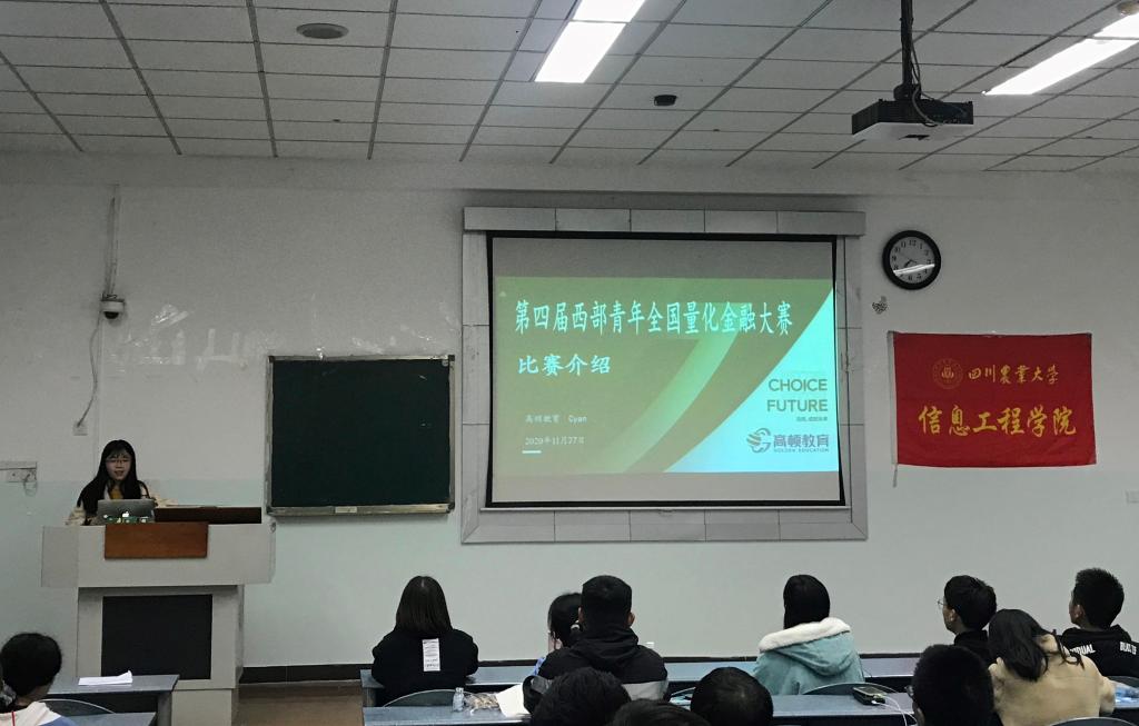 首先,高顿财经成都区域品牌及市场运营负责人杨恒麟致辞开场,简要介绍此次宣讲会的目的,并鼓励同学们积极参与比赛,与专家团共同推出作品,期待选手们在比赛中收获成长。随即,上海新高顿金融研究院研究员高顿老员工职业发展委员会委员暨西华大学职业发展导师同时也是担任本次全国第四届量化金融大赛组委会代表——廖艺详细讲解第四届西部青年全国量化金融大赛。她以三位金融巨鳄的相同与不同之处进行举例说明,让同学们能对量化金融有个初步的浅显认知,从而引出中国的金融发展趋势。她表示,科技不断推动新的金融服务模式发展,并对提升金融服务供给能力产生持续的推动力。除了互联网金融、基金、券商率先起步,传统金融机构如银行、保险、交易所等也在加大科技运用的步伐,中国金融科技生态圈的建设势在必行。随着在西部的竞争力逐步提高,成都将以全球的金融发展趋势为引领方向,而当今的人才培养目标也应当由单一的传统金融人才发展到需要掌握金融、数学、计算机、人工智能、大数据等技术的综合复合型人才。最后,廖艺还具体介绍了此次大赛的报名方法、比赛方式等。鼓励同学们积极参赛,能从实践中出真知,从而收获不一样的自己。同学们纷纷表示,通过宣讲会,对量化交易与金融的理解更加深刻,很期待参加中国西部量化金融大赛。