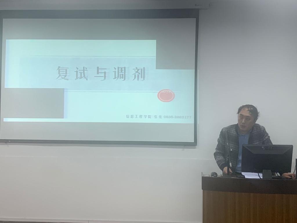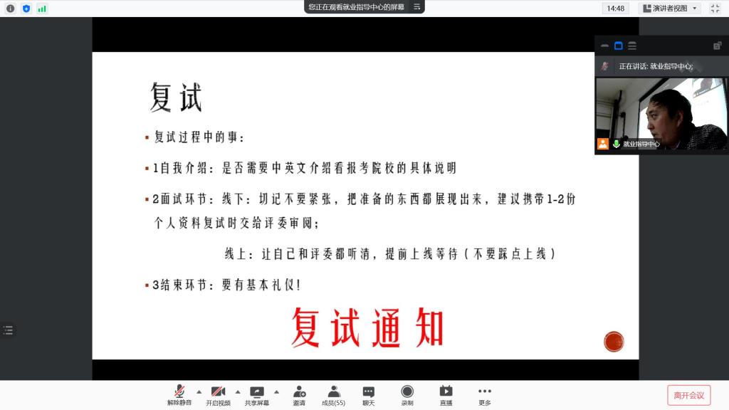 学党史、悟思想、办实事、开新局。今年,太阳成集团tyc151cc有230余名毕业生报考研究生,为让上线的同学都能顺利升学深造,实现高质量就业,3月16日晚,公司在4教210会议室,通过线上直播互动方式为考研员工开展了“考研复试调剂攻略公益直播课”活动,公司研究生就业秘书张亮博士主讲,活动由公司党委书记王中成主持。