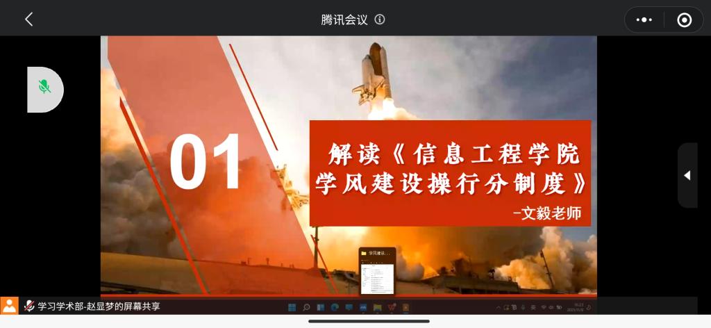 为进一步推进公司学风建设,营造良好的学习氛围,11月9日下午,公司于线上开展“师生携手争先优,你我同行建学风”学风建设大会。参加本次会议的有公司党委书记王中成,党委办公室主任、团委书记陈明滟,公司党委办公室老师文毅,员工会主席团成员及各小班班班委。会议由向建桦主持。