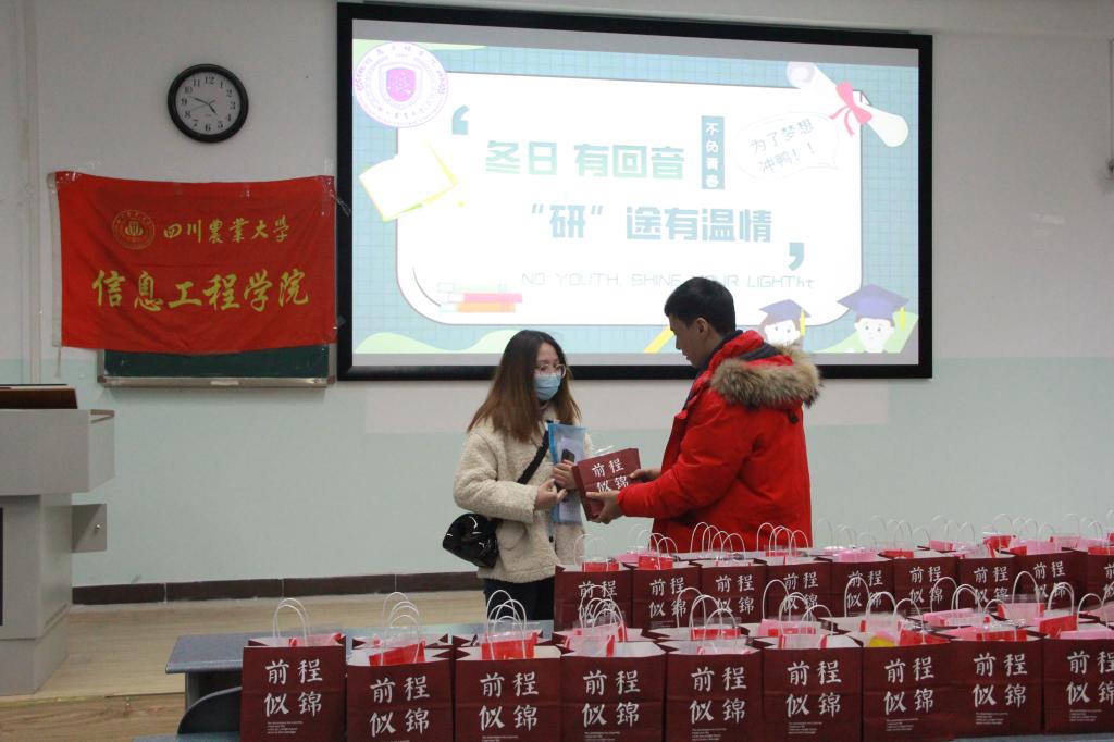 11月23日下午,信工院在十教A302开展了考研慰问会,暖心举措,助力考研,助力考生缓解压力,坚定考研信念,积极冲刺备考,同时为备考学子送去贴心礼包和美好祝愿。