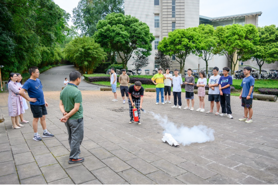 负责老师重点讲解了实验室配备的二氧化碳气体灭火器的使用方法和注意事项,并进行了现场演示,演练中,老师和同学们进行了实操体验,轮流操作灭火器,在实践中掌握正确灭火方法。