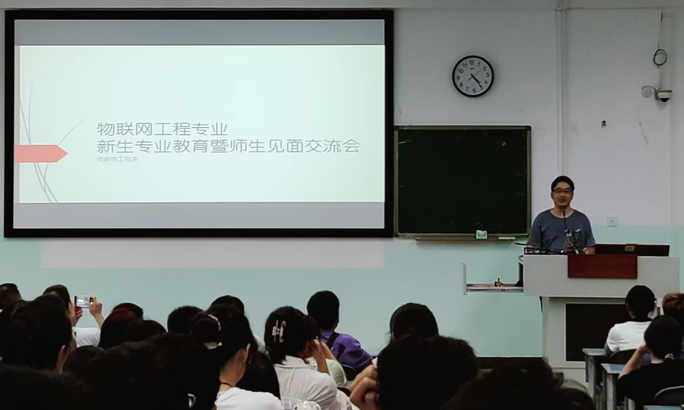 “物联网代表下一代信息发展技术方向,是新一代信息技术的重要组成部分,也是信息化时代的重要发展阶段。”物联网工程系主任王曼韬副教授从物联网工程涉及领域、专业历史沿革、培养方案、学习建议四个方面展开讲述。他介绍了专业的工科学科特点,强调实践和理论相结合、学以致用的重要性,同时突出物联网赋能多学科、“万物互联”的特点,介绍了专业未来发展方向并建议同学们加入工作室学习,为新生指明发展方向。同时,王曼韬鼓励新生要把出要把“能吃苦,要主动,会交流”的品质运用于大学的学习和生活之中,珍惜大学时光,为未来的升学就业夯实基础,实现人生价值。