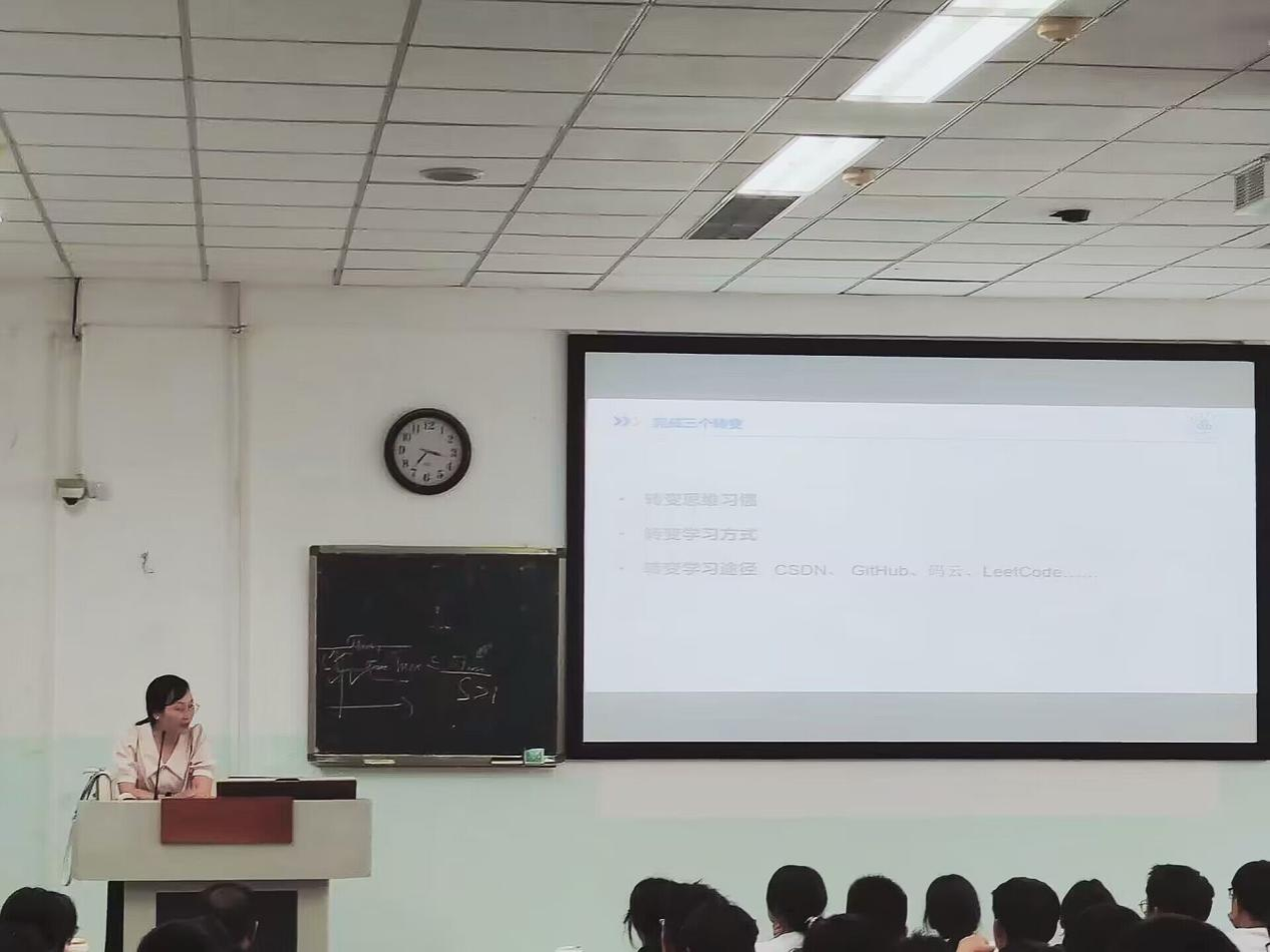 “我们专业学的到底是什么,该怎么学,学了能干什么?”计算机科学系主任陈晓燕教授以三个问题为导向,从专业认知、教师介绍、培养方案、学习建议四个方面展开,并强调了动手培养技术的重要性,“学以致用,我们想要将学到的知识转化为自己的能力,需要一个理论到实践的过程。”她还提出要强化员工实践技能培养,以“科学研究+专业竞赛”的培养模式提升员工就业竞争力。同时,陈晓燕介绍了专业未来发展方向及培养方案,建议新生早作规划,选好方向。分享“三转”的学习建议:转变思维习惯、转变学习方式、转变学习途径。鼓励同学们打开思维、变被动为主动、进行课外延伸学习。