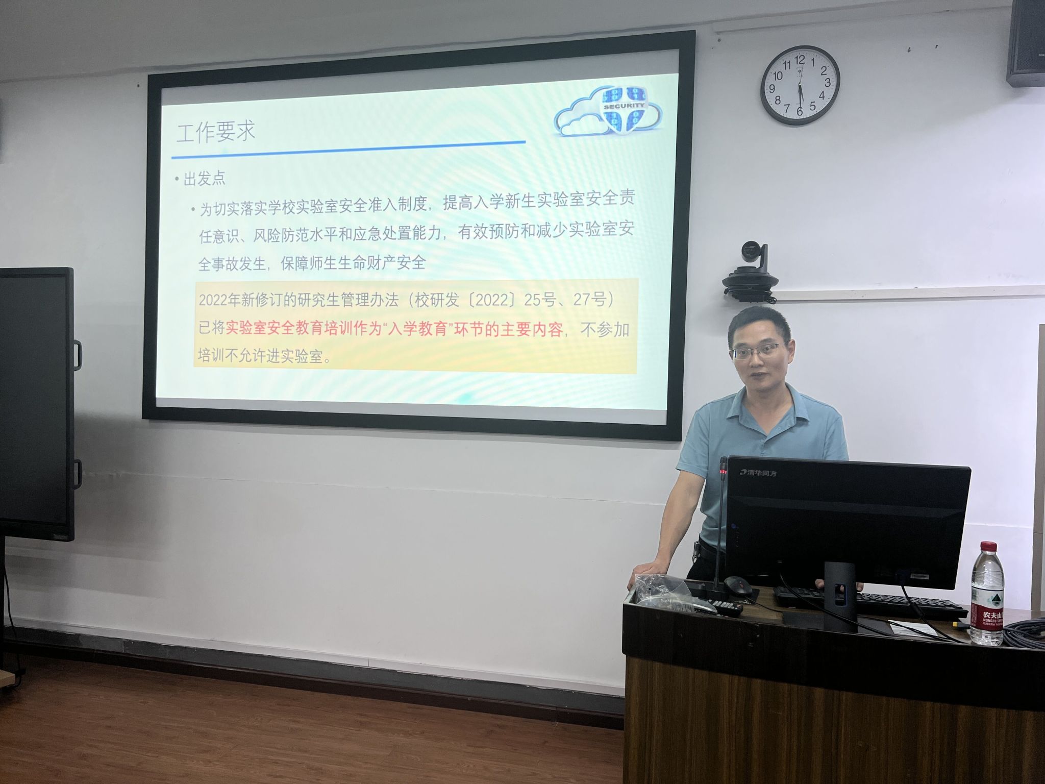 段旭良开展了实验室安全教育专题讲座,为全体2023级研究生进行实验室安全教育培训,明确实验室准入制度,培养实验室安全责任意识,提高全体员工的实验室安全风险防范水平及应急处理能力。他特别针对网络信息安全进行分享,他指出所有员工应明确网络信息安全政策法规,严格遵守网络信息安全规章制度,不断丰富自己的安全知识,做一个遵纪守法的太阳成集团tyc151cc员工。