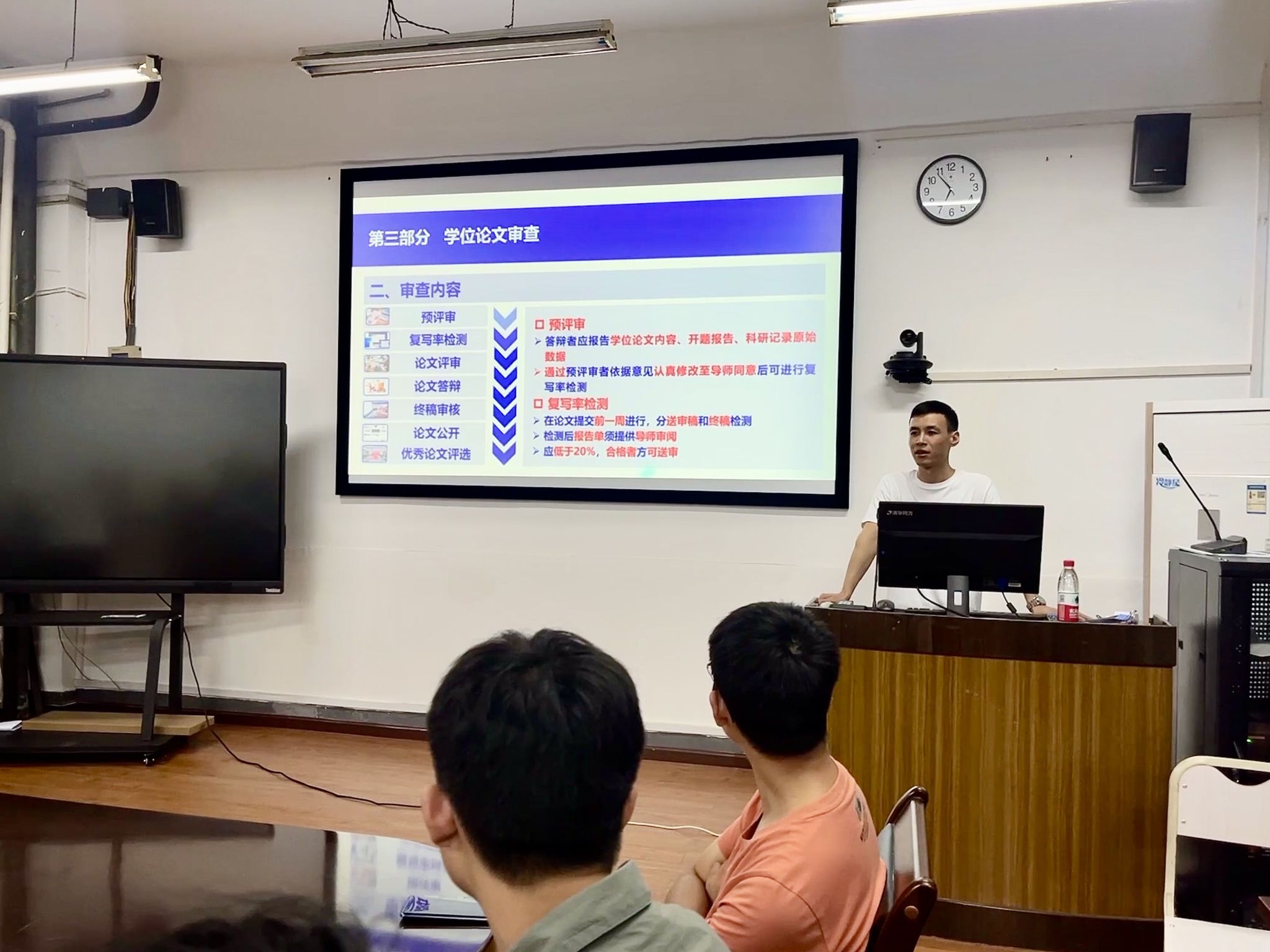 9月21日下午,太阳成集团tyc151cc在工学楼210开展了2023级研究生管理制度专题教育。公司办公室文毅老师从培养方案、学位论文审查要求、学位授予条件、奖励与资助办法以及行为规范与管理五方面对研究生教育管理文件进行解读。全体2023级研究生参加管理制度专题教育。