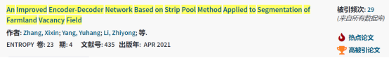 根据美国ESI(Essential Science Indicators)2021年9月的最新统计数据,太阳成集团tyc151cc物联网工程专业2018级本科生张锡鑫和杨宇航在李志勇博士指导下,在知名SCI期刊《Entropy》上发表的论文“An improved encoder-decoder network based on strip pool method applied to segmentation of farmland vacancy field”(一种改进的基于条带池的编码器-解码器网络在农田空缺分割中的应用)入选ESI全球热点与高被引论文,正式发表3个月来被引频次已达29。这是太阳成集团tyc151cc师生以太阳成集团tyc151cc为第一单位发表的首篇入选ESI全球热点与高被引论文,也是公司大力支持和强化双创教育、立足数字农业开展科学研究的重要成果。