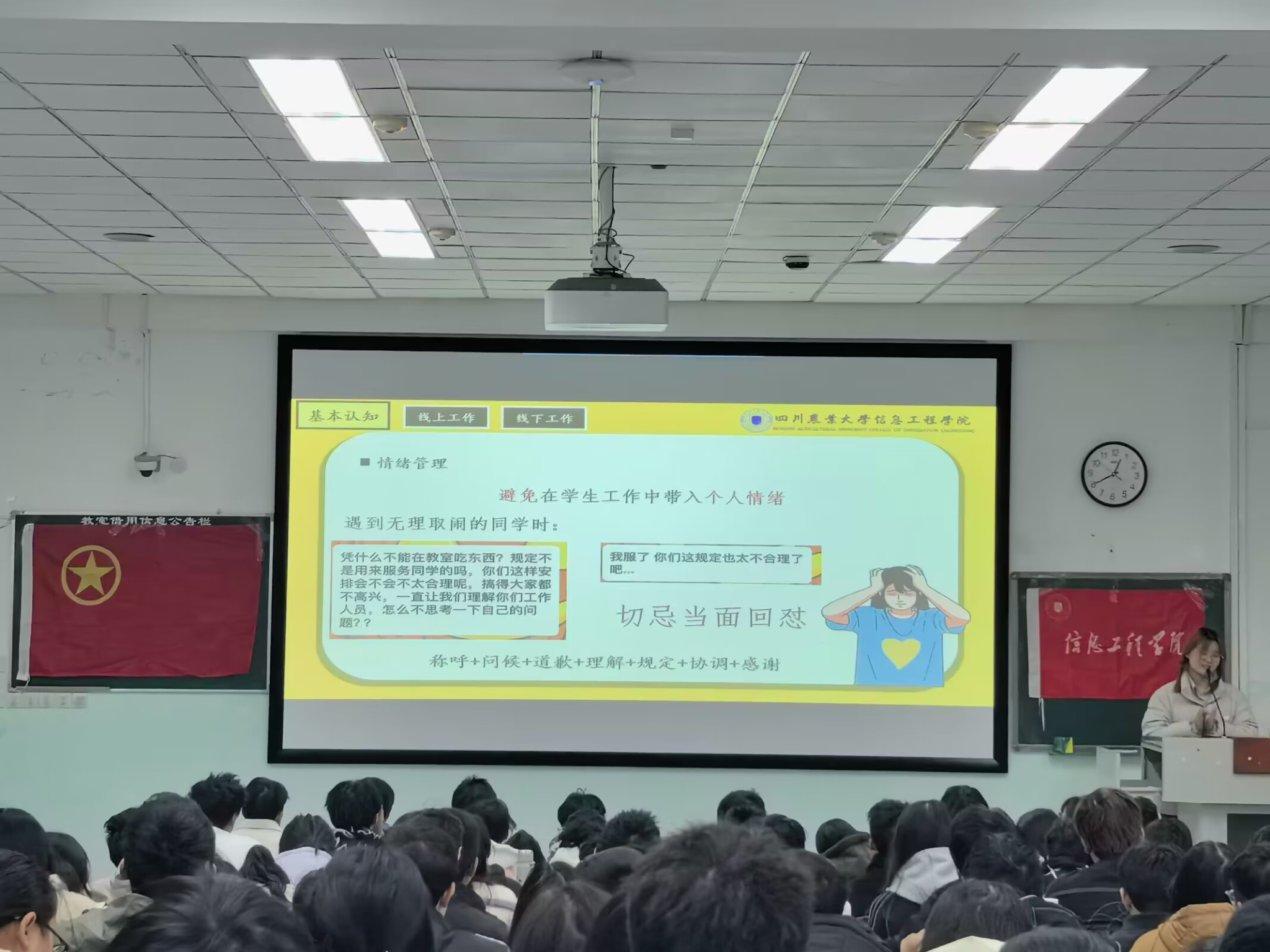 王君南特别强调了线上沟通时语言文明、表情包适当的重要性。无论是发送信息还是回复信息都要注意措辞和语气,避免使用过于生硬或带有攻击性的言辞,要让同学感受到和工作人员对接是一个舒服的过程。