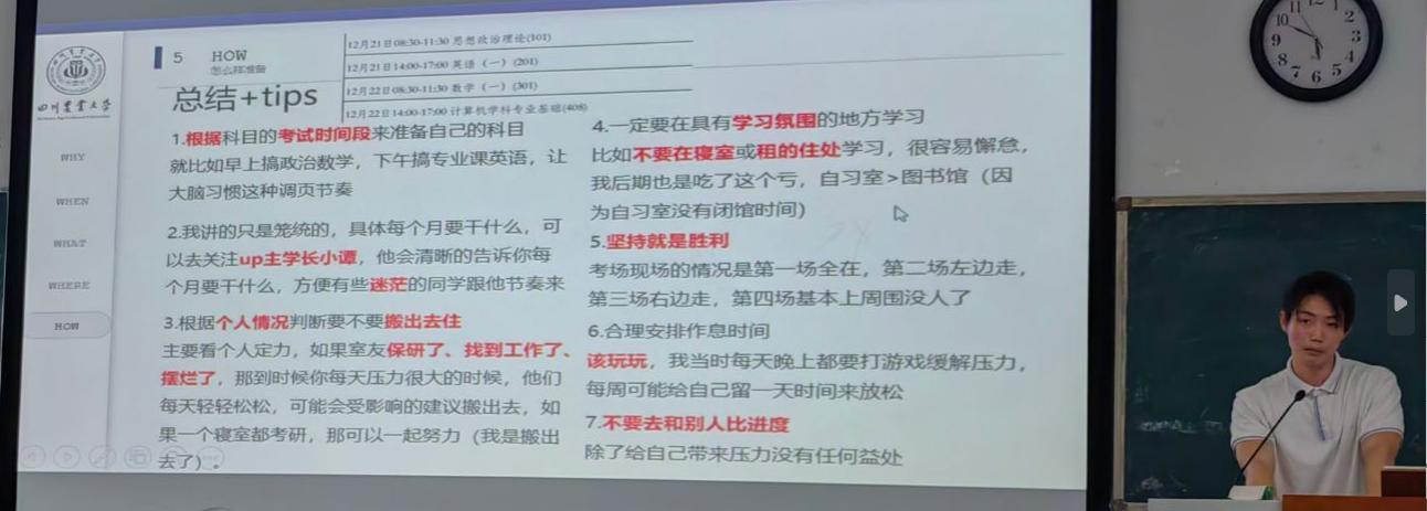 此次分享会成功举办,不仅为同学们提供了宝贵的学习机会,也坚定了大家追求梦想的决心。通过与优秀学长学姐的交流,同学们对升学有了更清晰的认识和规划,也更加清楚了解了考研保研路上的种种要求与困难。相信在未来的升学道路上,同学们能够更加从容地面对各种挑战,追逐自己的梦想。