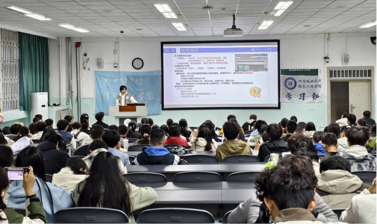 10 月 28 日的宣讲活动同样亮眼。人工智能应用实验室的邓安桐同学以“人工智能的发展与学习路径” 为主题,从基础理论到前沿应用,为同学们搭建了完整的知识框架;同时,通过自动驾驶路况识别、医学影像分析等贴近生活的项目案例,生动诠释了人工智能技术在实际场景中的应用价值,让同学们对这一前沿领域充满向往。ACU 志同合盟工作室的分享则展现了团队的多元实力。周胜翔同学围绕深度学习技术与科研竞赛成果展开讲解,鼓励同学们坚定专业信念,深耕技术领域;陈友淋同学通过 “一麦之秋”、“一帆风顺”、“打地鼠”、“贪吃蛇”等趣味项目,直观展示了前端开发的创意与魅力;金靖凯同学则以“基于 AI 一体化的智慧医学影像辅助诊疗系统” 为核心,深入剖析后端技术在医疗领域的关键作用,讲解技术赋能行业发展的重要意义。