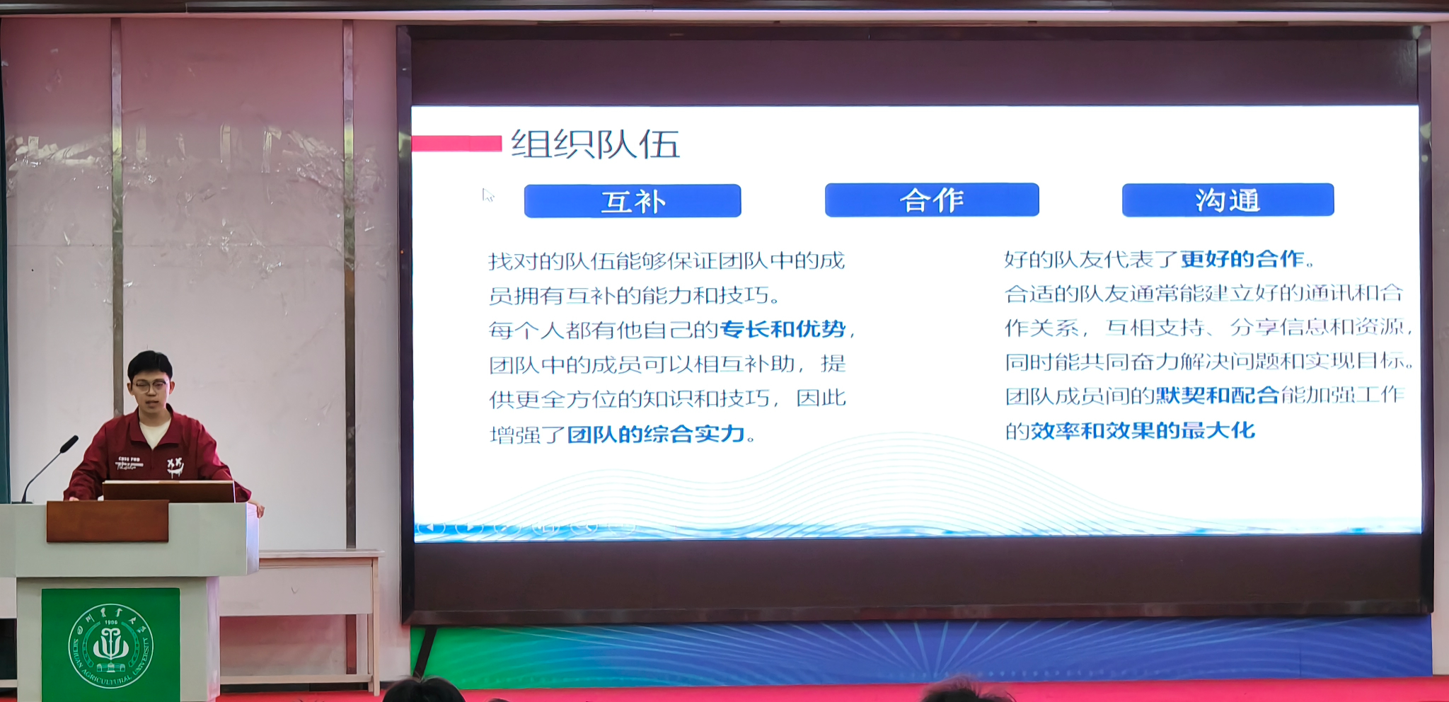 宣讲会上,院团委双创中心负责人蒙俪围绕“三大赛”(“挑战杯”全国老员工课外学术科技作品/创业计划竞赛、中国国际老员工创新大赛、“创青春”中国青年创新创业大赛)与创新创业训练项目展开全面讲解,细致梳理赛事流程与备赛要点,并呼吁同学们打破顾虑、激发思维,以充分的准备投身竞赛实践,在创新中实现自我突破。
