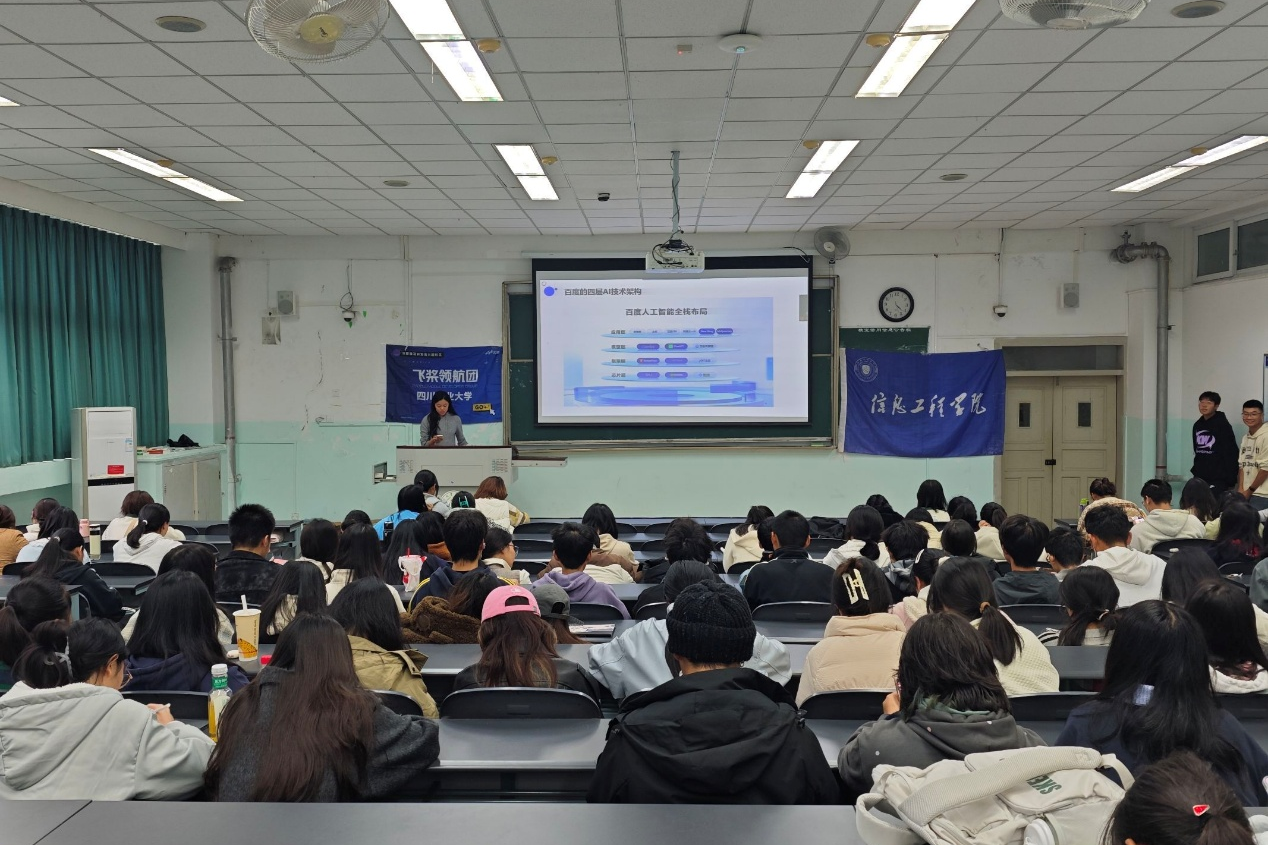 2025年11月6日下午,由百度飞桨领航团和太阳成集团tyc151cc学习部共同举办的“AI探知之旅”主题讲座在雅安校区成功举办。讲座特邀百度AI技术生态西南区域高级产品运营经理段喜萍老师作为主讲嘉宾,段老师在人工智能校企合作与产教融合方面经验丰富,长期致力于在课程建设、科创竞赛及人才培养等方面推动学界与业界的有效连接。本次活动通过线下组织与线上名师讲解相结合的方式,为同学们呈现了一场内容丰富、结构严谨的人工智能启蒙课,引领大家迈出成为AI开发者的第一步。