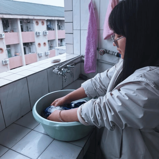 图为参与同学洗涤志愿服的场景