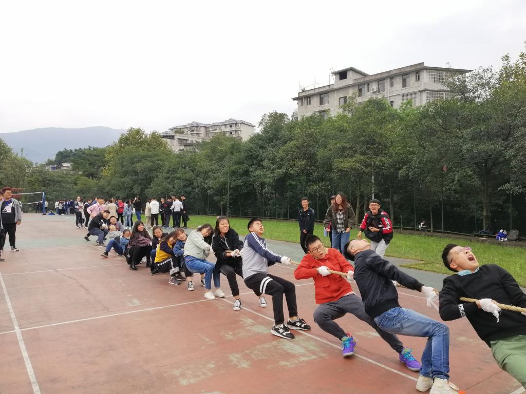 比赛中,参赛队员脸上带着紧张和兴奋的神情,裁判哨声还未吹响,双方队员即进入“战斗”状态,双手紧握麻绳,双脚用力着地,身体微向后倾——参赛队员齐心协力凝成一股绳!裁判哨声一响,双方队员气势轩昂,口号声响彻云霄,有的同学把脸憋得通红却丝毫不放松,有的龇牙咧嘴用尽浑身解数,还有的干脆闭上眼睛卯足了劲儿往后拉,女生们更是不甘示弱,一个个咬紧牙关,丝毫不敢懈怠,场外的班级拉拉队也不甘示弱,加油声、呐喊助威声此起彼伏,生怕声音小了,输了气势。