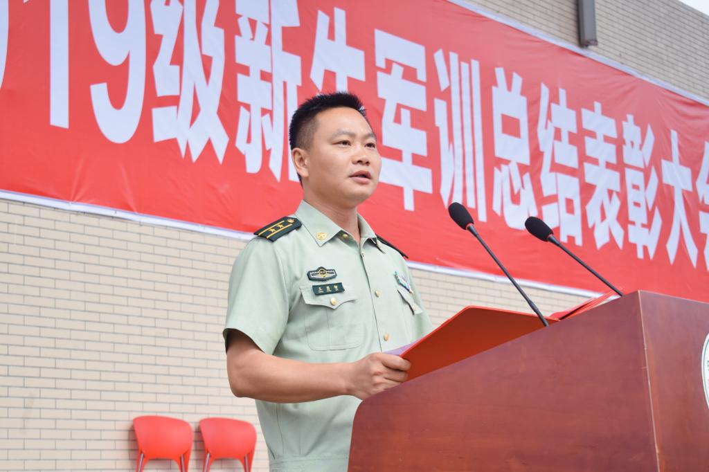 “5、4、3、2、1、0,文者成雄,武者成霸,表演天团,雄霸天下。”9月12日上午,2019级新生军训总结表彰大会由军训汇报演出总指挥、军训团罗启明参谋长组织分列式汇报表演。