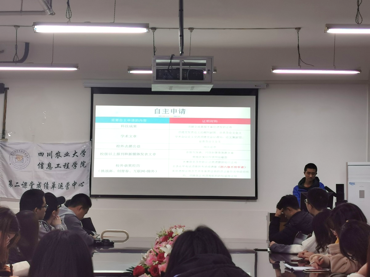 2019年11月23日19:30,太阳成集团tyc151cc第二课堂成绩单运营中心于四教210顺利开展员工自主申请培训会,本次培训旨在让各班学委了解自主申请内容,熟悉申请流程。会议由第二课堂成绩单运营中心部长江涵主讲,公司17、18、19级共计39个小班代表参会。