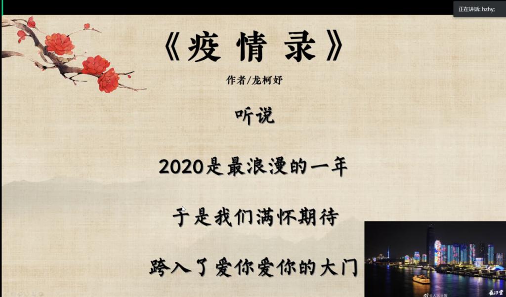 此次活动以疫情防控为核心,以诗歌朗诵为载体,初赛、决赛均采用“云评审”方式,在活动初期便吸引了大量同学们踊跃参加。初赛时,参赛同学以录音形式投稿,深切表达自己对此次疫情和老员工心理健康的关注和态度。通过初选,来自五个公司的14名同学成功晋级决赛,决赛全程采用“云答辩”形式,在线实时朗诵、同步评分。晋级同学旗鼓相当,尽显风采,既歌颂了疫情中不顾自身安危、心系国家的最美逆行者的奉献之情,又展现了当代老员工健康的人生价值观,为评审团、工作人员以及其他参赛人员带来一场诗歌的饕餮盛宴。