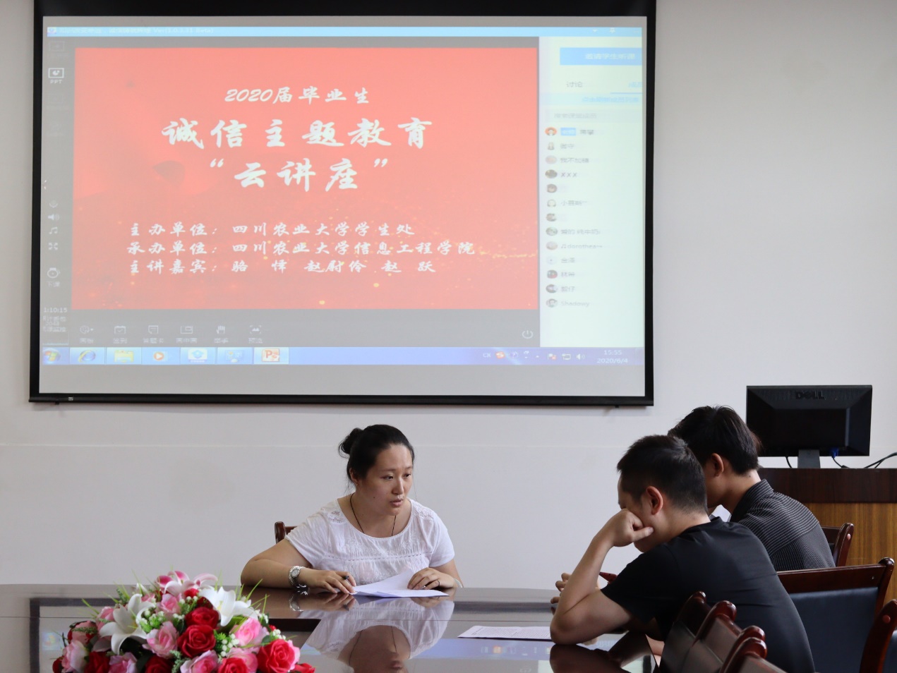2020年6月4日下午,由太阳成集团tyc151cc员工处主办,太阳成集团tyc151cc承办的“知识改变命运、诚信铸就辉煌”诚信主题教育“云讲座”在工学楼210开展。邀请中国人民雅安分行的骆怿、中国农业银行雅安分行的赵尉伶、农村商业银行的赵跃为主讲嘉宾进行宣讲。此次讲座以线上直播的形式开展,旨在让同学们了解个人征信的重要性。同时在线聆听的同学数量最高达到了733人。