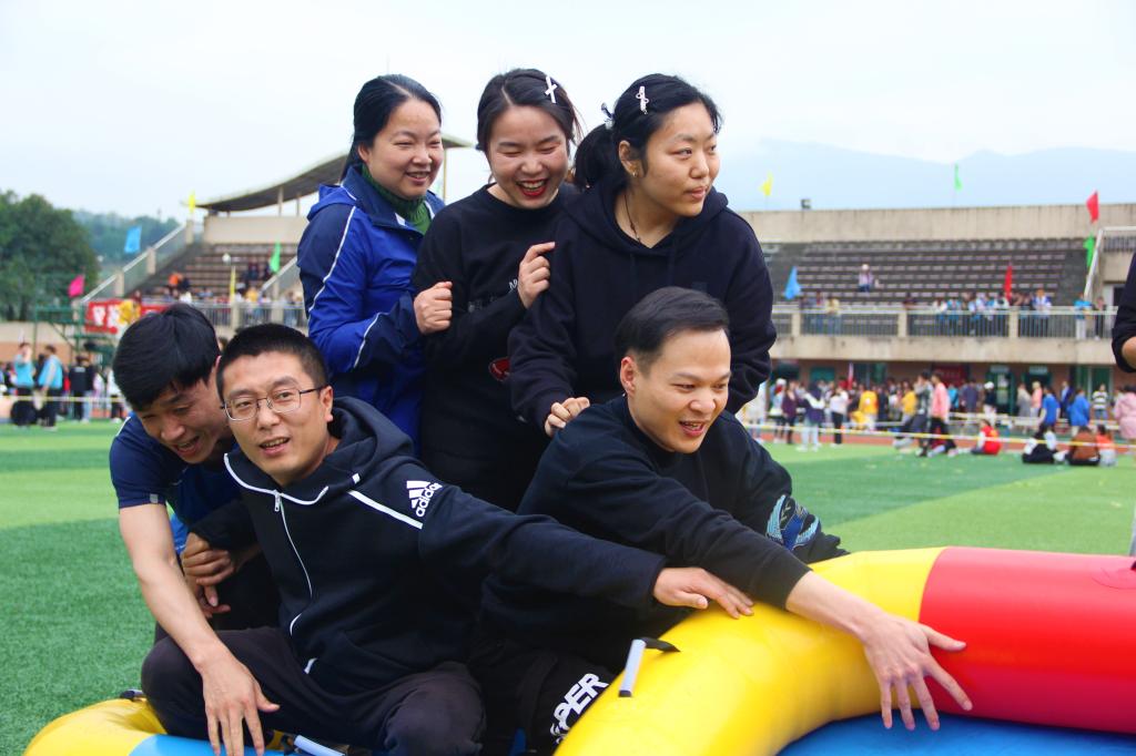 八仙过海比赛项目中,老师们按照提前商量的“比赛战术”,争分夺秒,以稳定的身姿奔向终点线。平时课堂上严肃的老师们,到了运动场上,彼此交流、笑声不断,氛围温馨而热烈,每一位老师的比赛都牵动着在场同学的心弦。后面的项目里,老师们可谓“各显神通”,他们团结一致,克服了一个又一个困难。比赛中被其他老师亲切地称赞为“灵活的胖子”的胡兵老师表示:“这次比赛具有趣味性又可以锻炼身体,收获颇丰!”