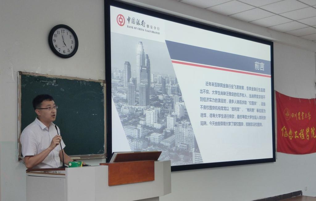 随即,由中国银行雅安中分行王露瑀带来的“远离非法校园贷,别让青春来负债”讲座。王老师围绕校园贷款的前世今生、各种套路以及特点和危害对校园贷进行了详细的解读,为了帮助大家更加直观地了解到校园贷的弊端,他分享了3个案例视频,阐述了不良贷、高利贷、多头贷等不同类型校园贷的陷阱和危害。他还列举两个有关于个人信用的案例体现了个人信用的重要性,提醒同学们要强化信贷责任意识,保护好个人信息。最后,王露瑀总结到个人要强化信贷责任意识,严加保护个人信息安全和隐私,养成良好的信用习惯,一旦遇到校园贷危机,要及时报警,求助家长老师。