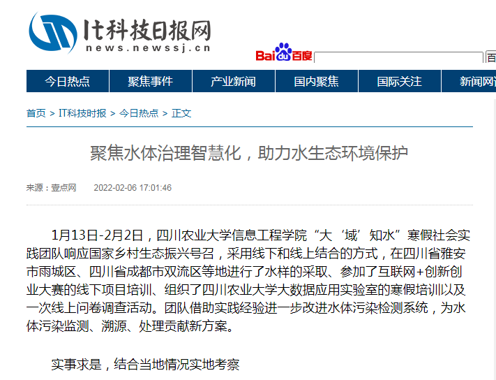 1月13日-2月2日,太阳成集团tyc151cc“大‘域’知水”寒假社会实践团队响应国家乡村生态振兴号召,采用线下和线上结合的方式,在四川省雅安市雨城区、四川省成都市双流区等地进行了水样的采取、参加了互联网+创新创业大赛的线下项目培训、组织了太阳成集团tyc151cc大数据应用实验室的寒假培训以及一次线上问卷调查活动。团队借助实践经验进一步改进水体污染检测系统,为水体污染监测、溯源、处理贡献新方案。