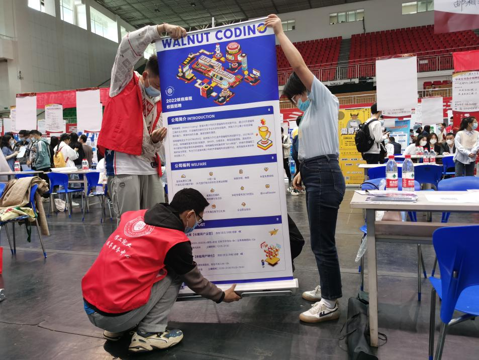 双选会开展数日前,公司就业指导中心便确认了到院招聘企业的名单。4月24日20余名志愿者齐心协力完成了所有参会企业的海报填写、座椅摆放以及分会场整体设计和布置。