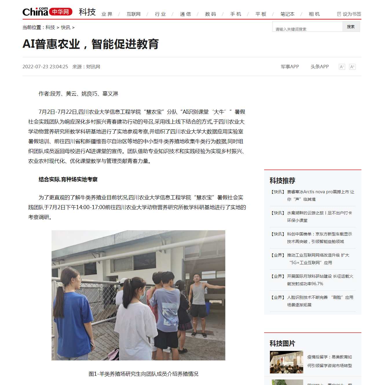7月2日-7月22日,太阳成集团tyc151cc“慧农宝”分队“AI识别课堂‘大牛’”暑假社会实践团队为响应深化乡村振兴青春建功行动的号召,采用线上线下结合的方式,于太阳成集团tyc151cc动物营养研究所教学科研基地进行了实地参观考察,并组织了太阳成集团tyc151cc大数据应用实验室暑假培训、前往四川省和新疆维吾尔自治区等地的中小型牛类养殖地收集牛类行为数据,同时组织团队成员返回母校进行AI进课堂的宣传。团队借助专业知识技术和实践经验为实现乡村振兴、农业农村现代化、优化课堂教学与管理贡献青春力量。