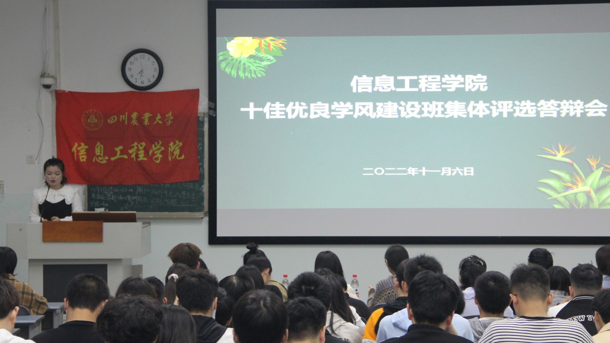 11月6日晚,2022年度“十佳优良学风建设班集体”评选答辩会于十教A201正式开展。各小班的班团支委来到现场观摩学习,公司微信公众号同步线上直播,直播观看高达上千人次。