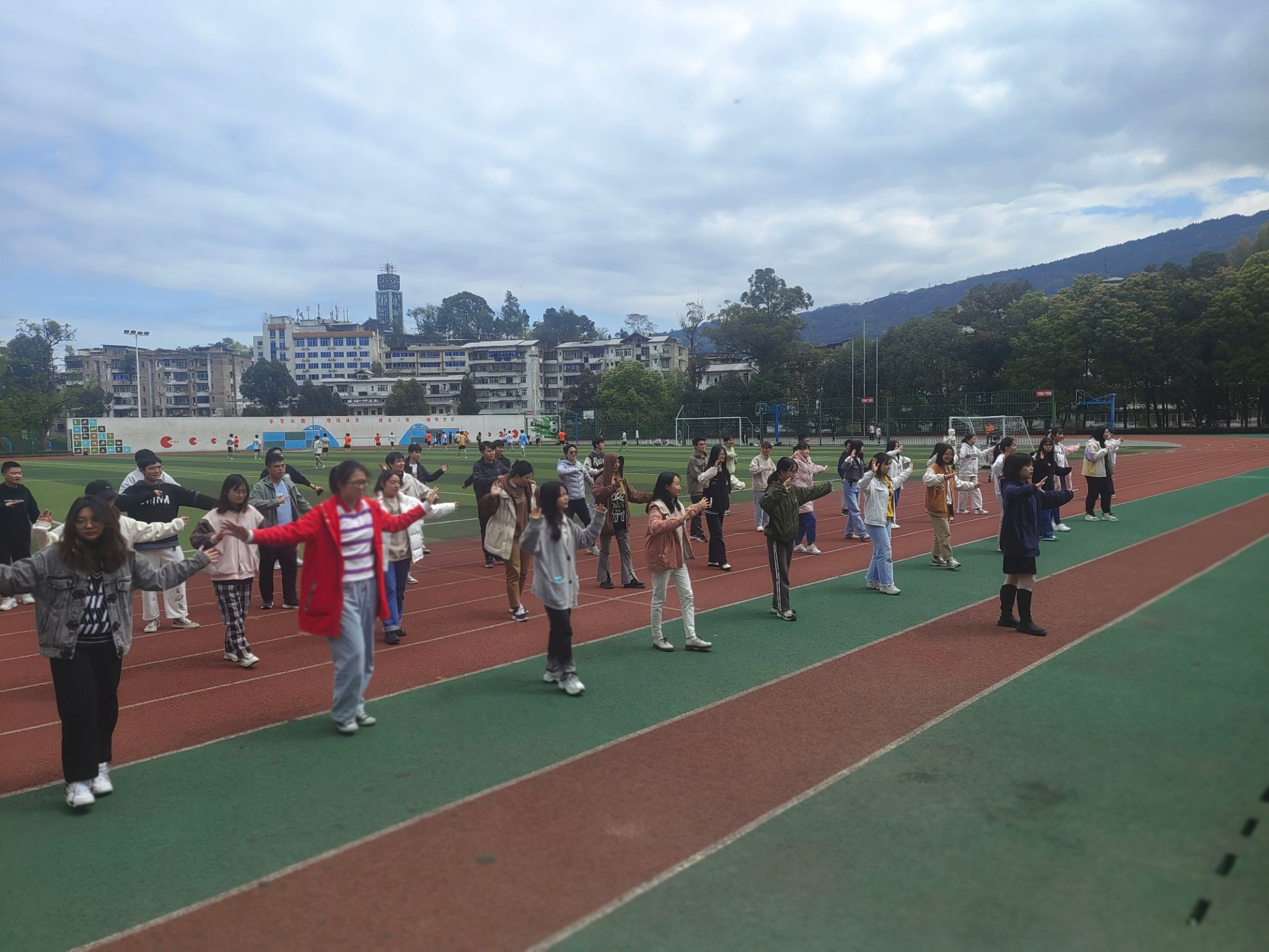 本次健美操所跳项目为第十届全国少数民族传统体育运动会民族健身操规定项目。在老区操场的跑道上,参赛选手整齐排列成方队,由主席团成员赵显梦进行领操《踩踩踩》,以选拔本届健美操运动员。结合当日选手跳操情况,进行健美操方针比赛人员选择,后期将进行公布。同时,结合结果,公司相关部门会结合实际情况开展相关训练、服装选购、音频剪辑等工作。