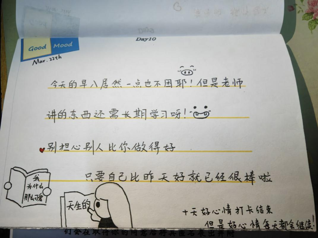 本次活动以“心情”为主题,主要采取打卡形式来开展活动。自3月13日起,同学们每日合理运用“好心情记录册”,将好心情以图文形式记录在册,将坏心情随着纸张而“撕去”。简单的小册子记载着同学们的喜怒哀乐,绘出了他们日常生活的丰富多彩。信工院以此方式引导同学们专注每日身心的变化,照顾身心,在发现负面情绪时能及时地将其转化,在拥有好心情时能将其记住并保持,从而调节好日常情绪,保持良好的心态。